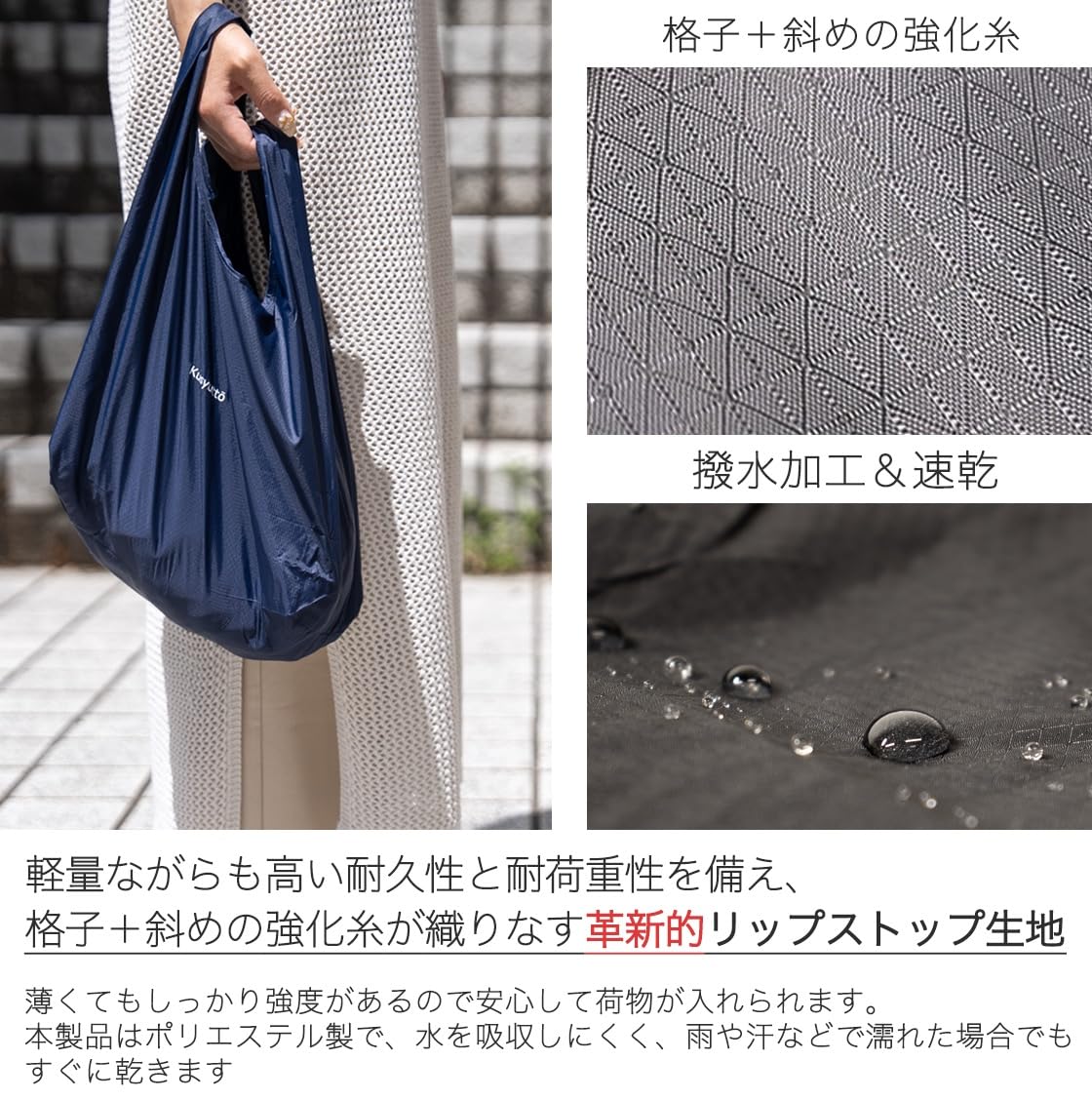 ??【仕様】使用時:約縦56cm(持ち手含)×横36cm×マチ10cm、収納時:約7×5cm、重量:約24g、耐荷重:25kg、素材:ポリエステル