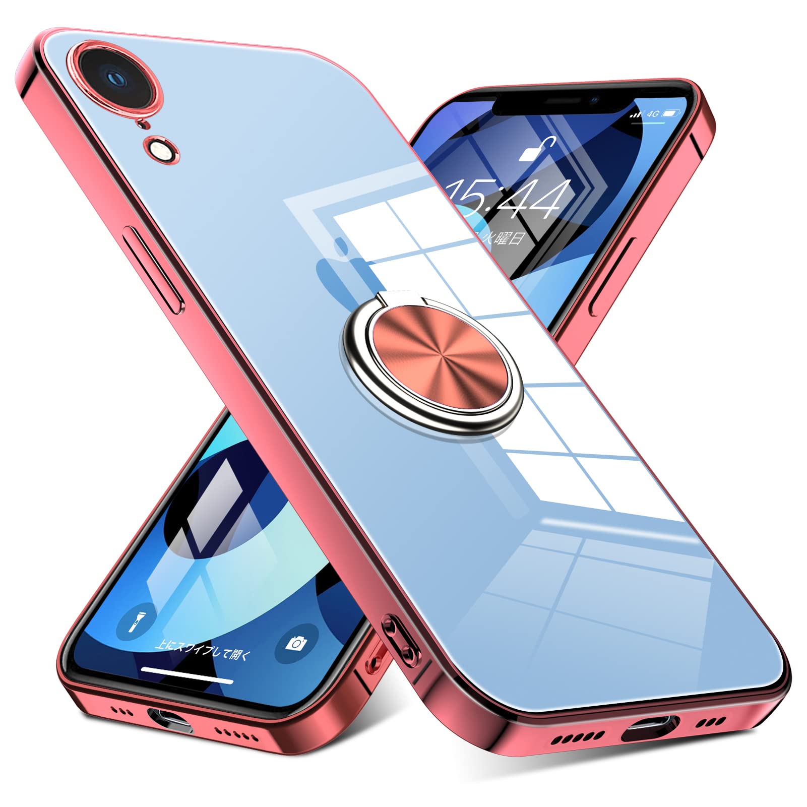 iPhone XR 用 ケース リング付き クリア 耐衝撃 スタンド機能 透明 TPU 車載ホルダー対応 落下防止 防塵 薄型 軽量 一体型 変形防止 全面保護カバー アイフォン XR 用 ケース ピンク W-YXZH-07-06