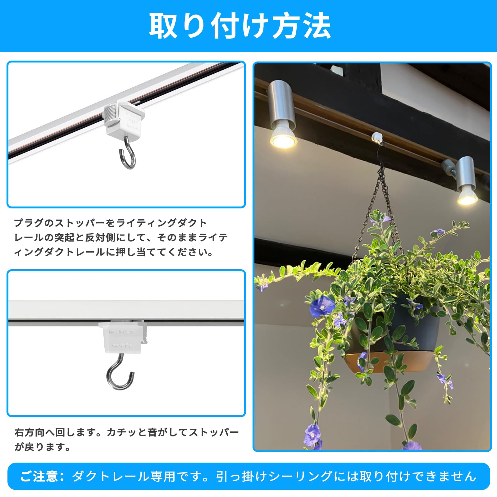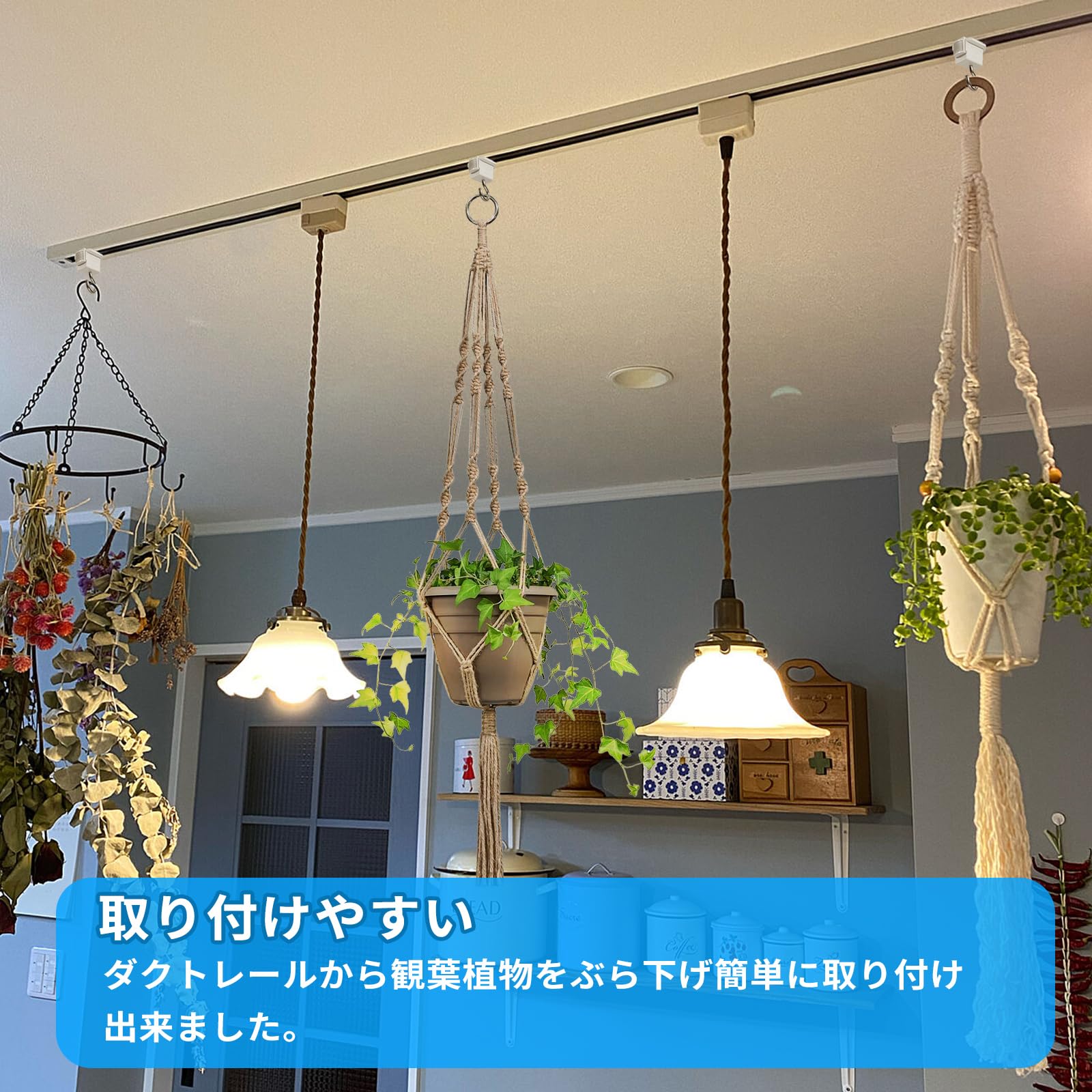 2、【特長】ダクトレールにはめて半回転させるだけなのでとても簡単に設置できます。ドライフラワーのスワッグなど軽いものを引っ掛けるのに使用しています。フックがあると色々アレンジできますし、フックにグリーンを飾ると部屋の雰囲気も変わってなかなか良いですね。