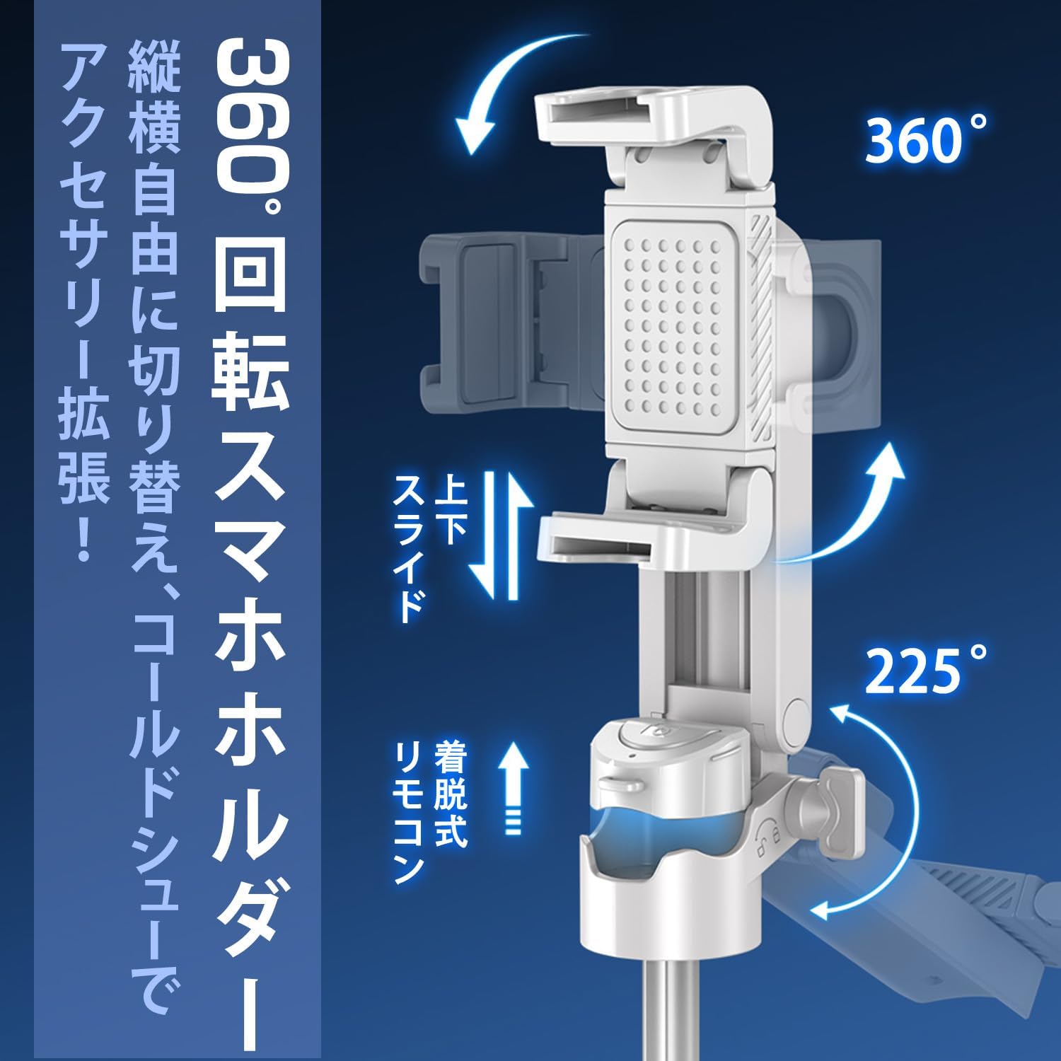 【簡単操作の折りたたみ式四脚】安定感を高める四脚構造で、傘のようにワンボタンで簡単に広げられる設計です。広げるとしっかりと固定され、地面やテーブルに置いても安定して撮影が可能です。自撮りやグループ写真、ビデオ通話など、さまざまなシーンで活躍します。
