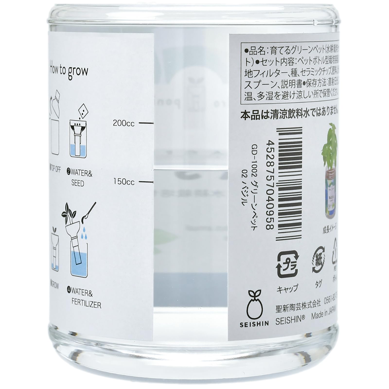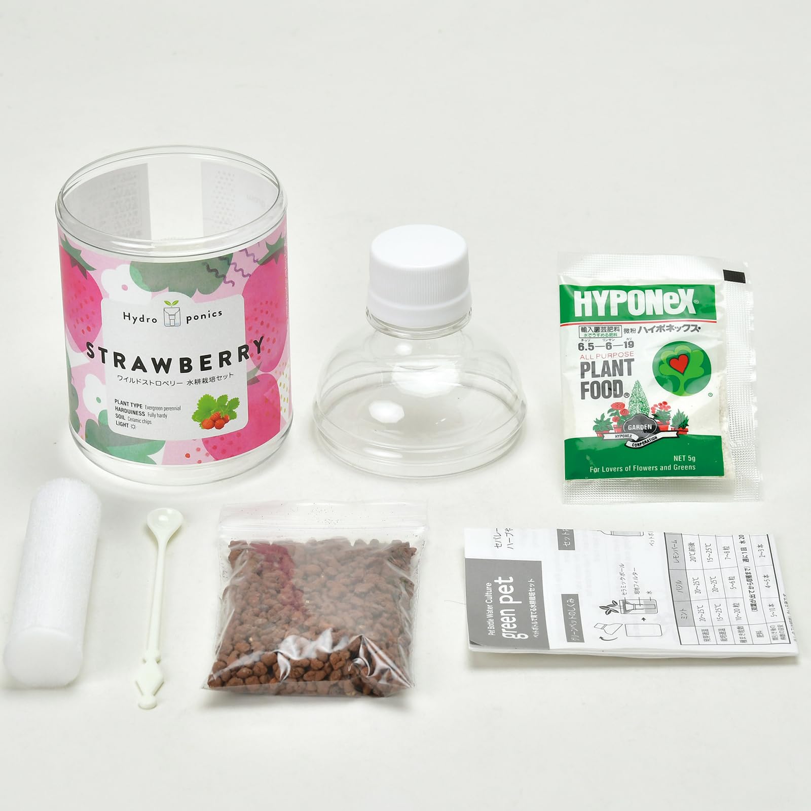 セット内容:ペットボトル型栽培容器,培地フィルター,セラミックボール,肥料,計量スプーン,種,説明書(日本語/英語)