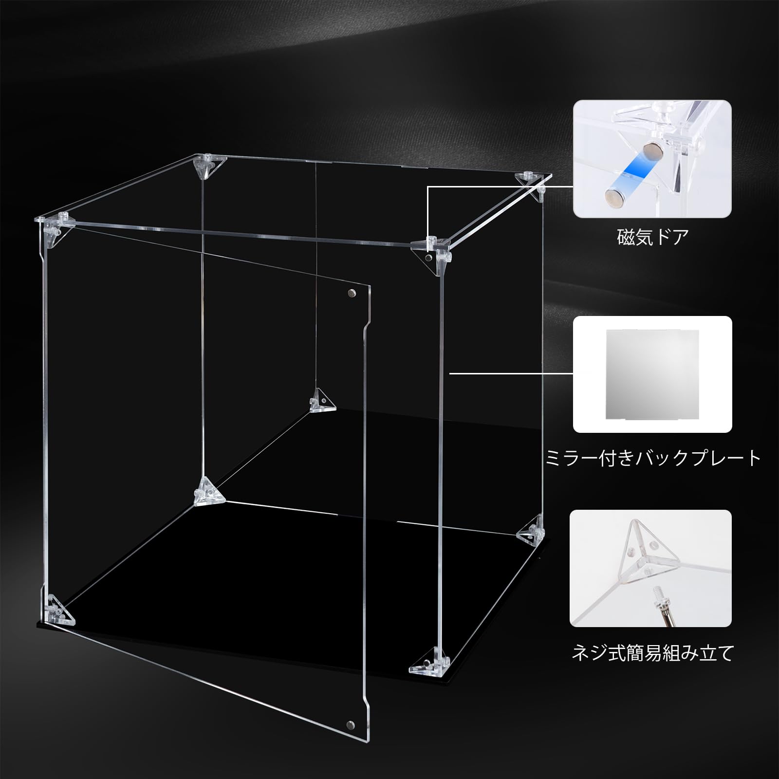 【商品詳細】(外寸)横幅15×奥行15×高さ15cm。台座((黒))・背面ミラー仕様。保護フィルム付。マグネット前扉。素材:アクリル 【30日間の期間】不良品の無料交換・サービスを提供いたします。
