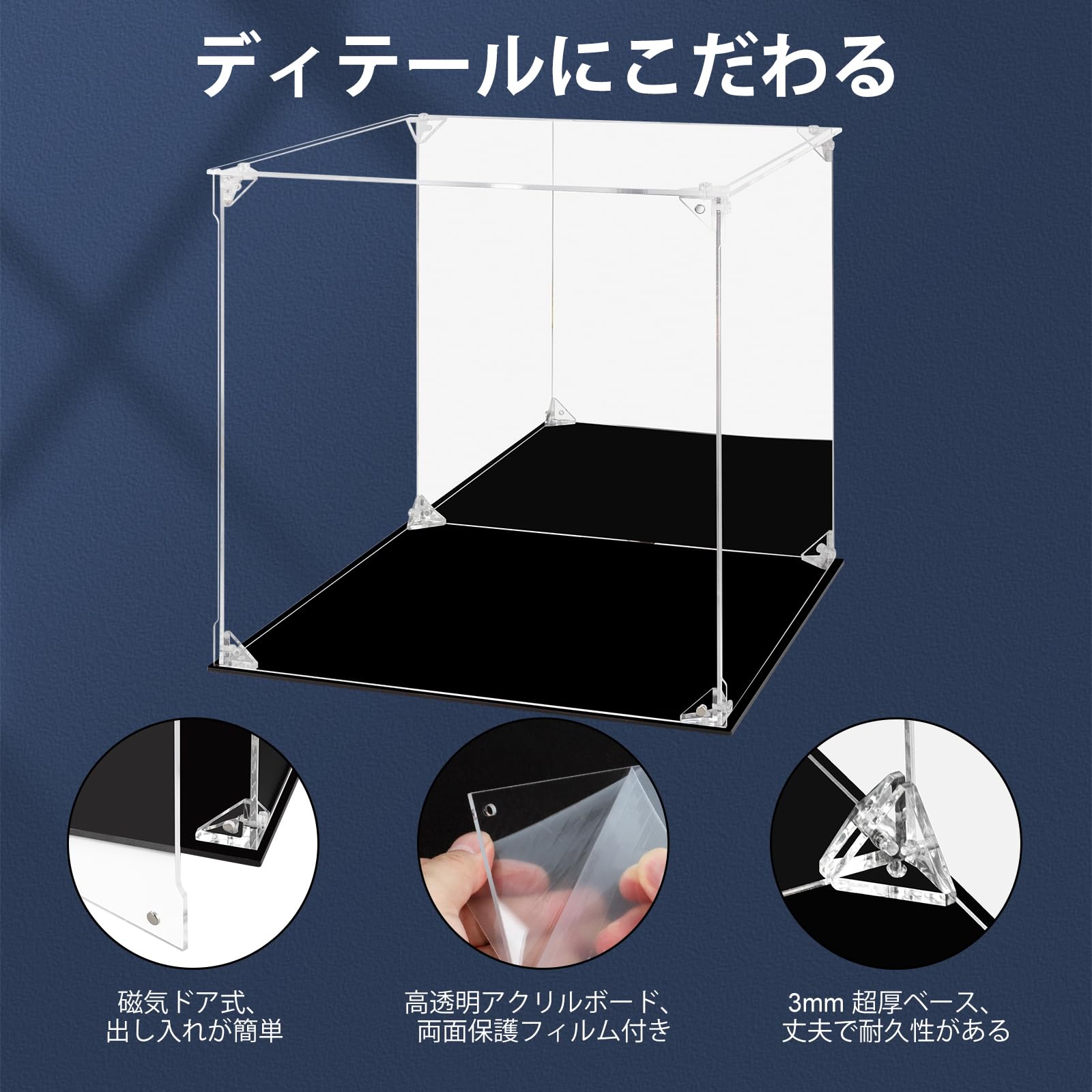 【安定感UP】 透明度の高いアクリル素材とユニークな三角結合構造により、圧倒的な堅牢性を実現しています。予期せぬ衝撃でも崩れ落ちにくい強度の連結構造は、お気に入りのモデルを保護するのに最適です。 ケースの角を完全に固定する為、片手で持ち運ぶことも可能。