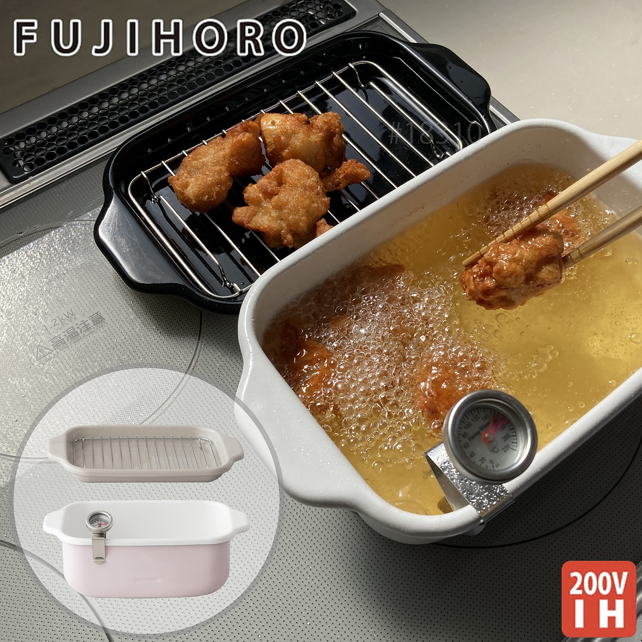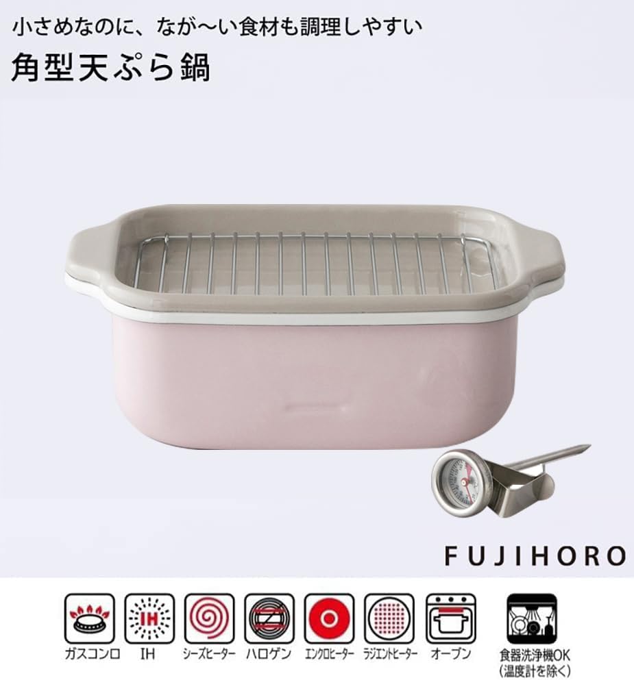 【人気】 富士ホーロー(Fuji Horo) 角型 天ぷら鍋 ピンク IH 対応 温度計 揚げ網 バット 付き ギフト