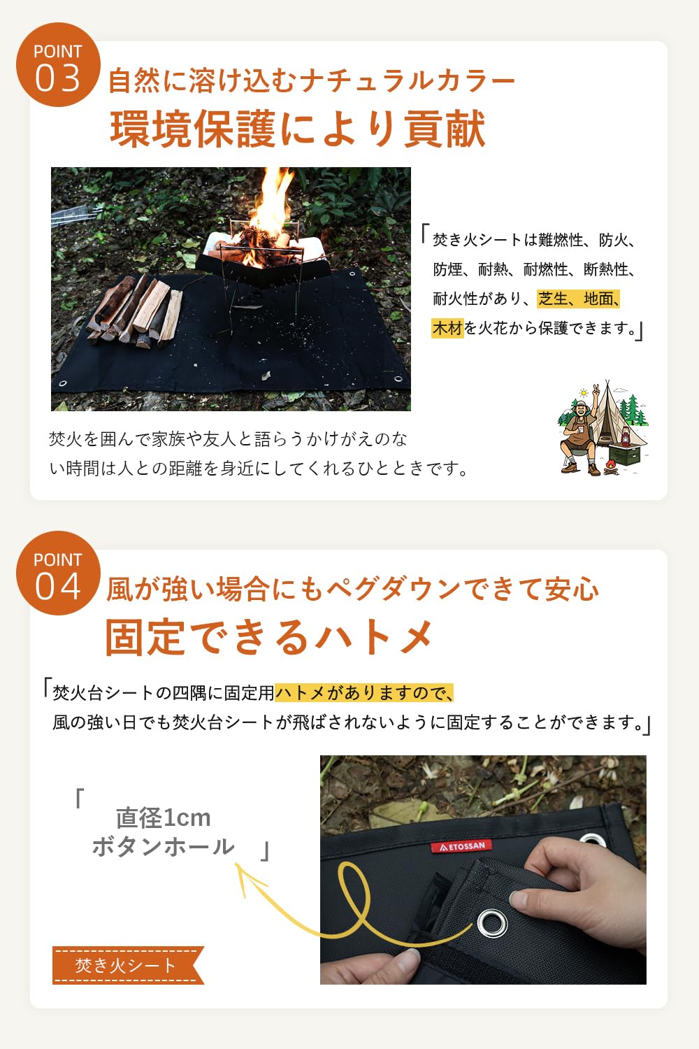 【使用方法】この製品は耐火耐熱のシートであり、断熱シートではありません。高温の物体をテントシートに置くと、熱がテントシートを通じて地面に伝わる可能性があります。火花が飛び跳ねるのを防止するためのツールとして使用してください。一般的に、ガラス繊維製の焚き火シートは、地面が飛び散る火花を短時間加熱し、火災の蔓延を防ぐことができますが、焚き火台から放射される持続的な熱は地面に伝わります。地面や芝生を保護するために、焚き火台と焚き火シートの間に、火床や地面から20cm以上離れた物体、湿った木材などの断熱性のある物体を置いてください。