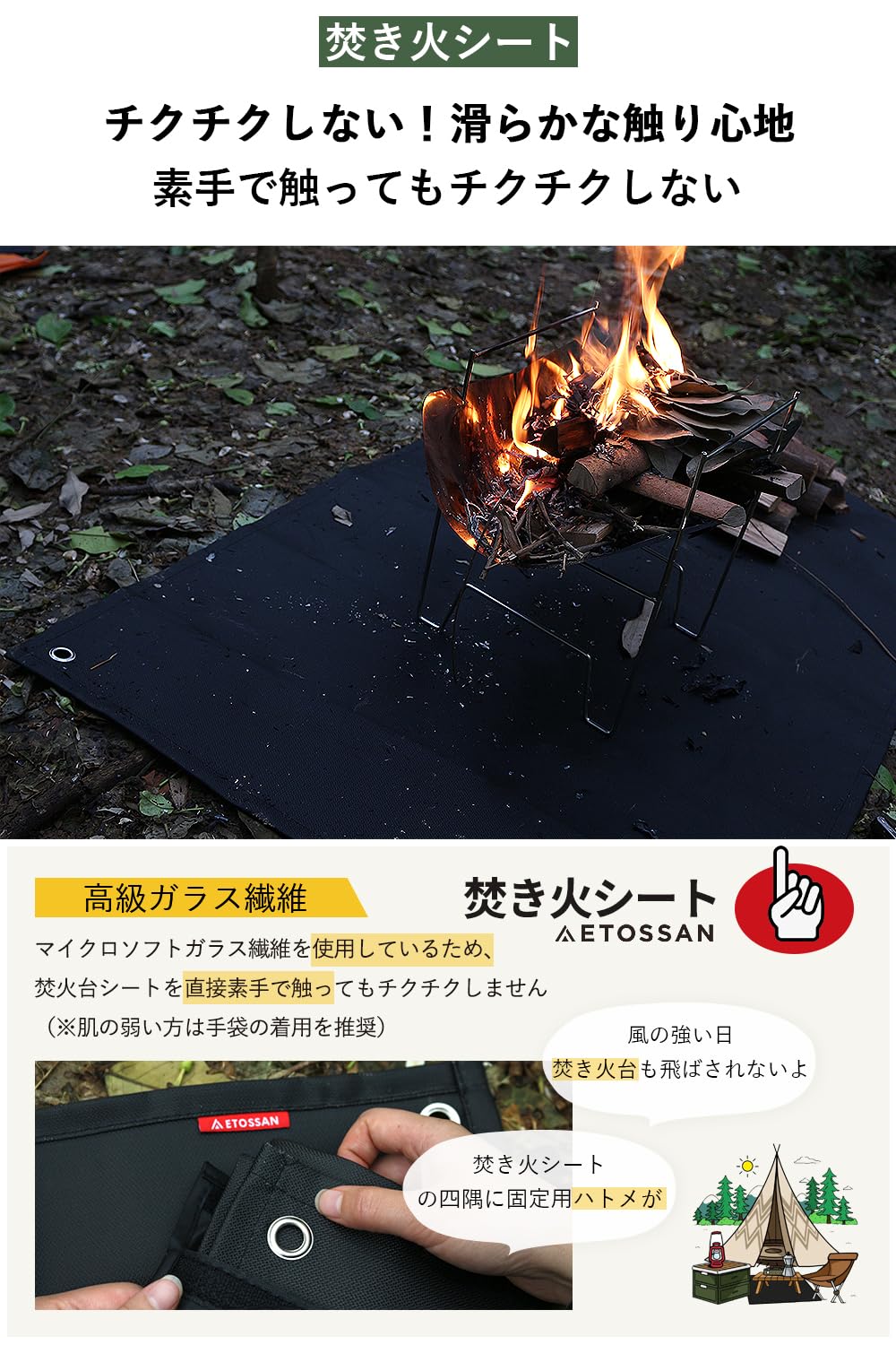 【チクチクしない】第二世代焚き火シートは、サイズが56×60cmで、重量は約200g、ブラックのファッショナブルなデザインで、製造技術がアップグレードされ、表面が一般的なガラス繊維よりもより滑らかで柔らかくなり、より柔らかいガラス繊維を使用しており、触ることができます(敏感肌の場合は手袋を使用することをお勧めします)。見た目が美しく、人気があります。