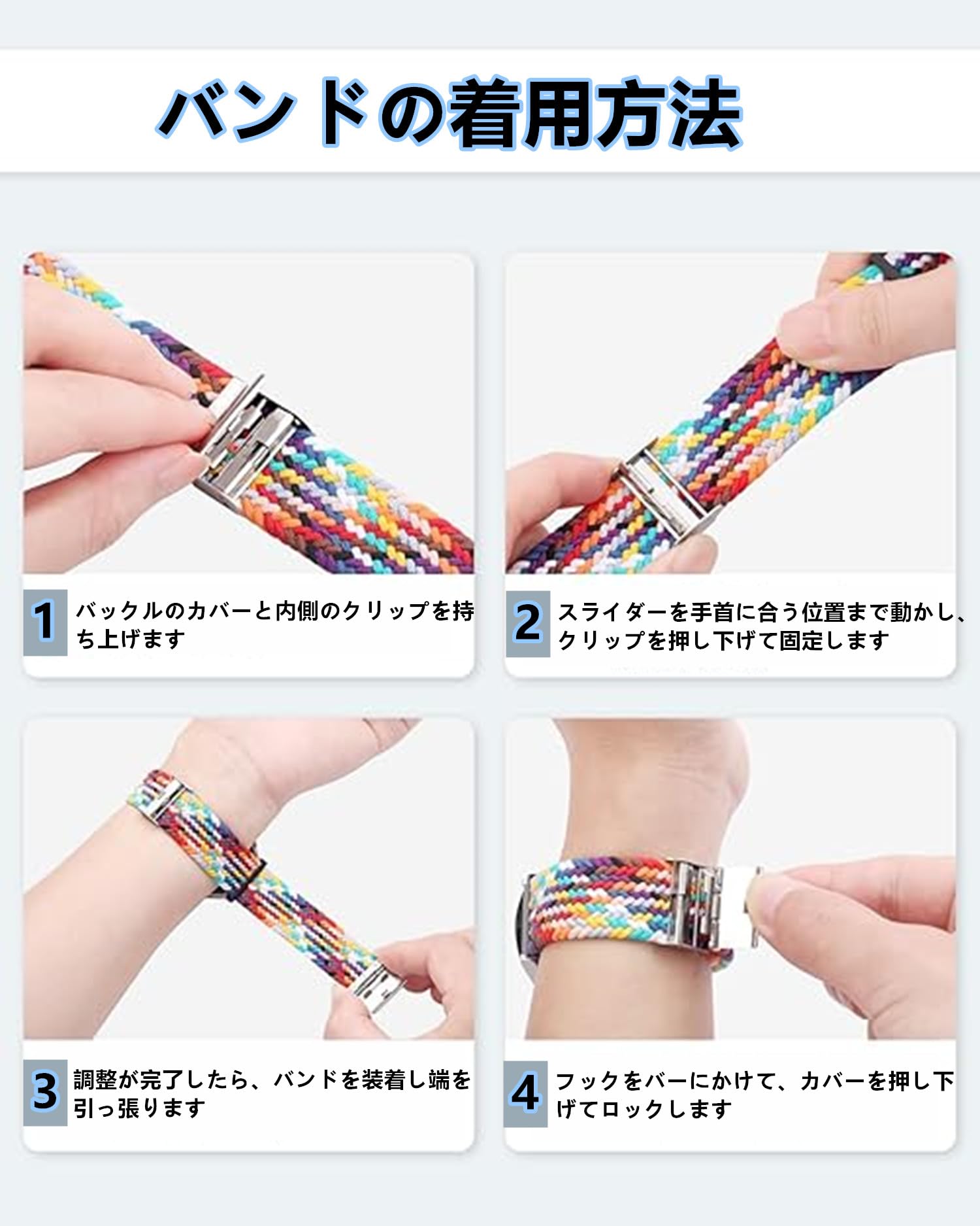 調整可能なバックル:ワンタッチで長さ調整ができるステンレススチール製バックル付き。しっかり固定でき、運動時にもズレにくく快適。ミニマルなデザインで日常使いにもぴったりです。