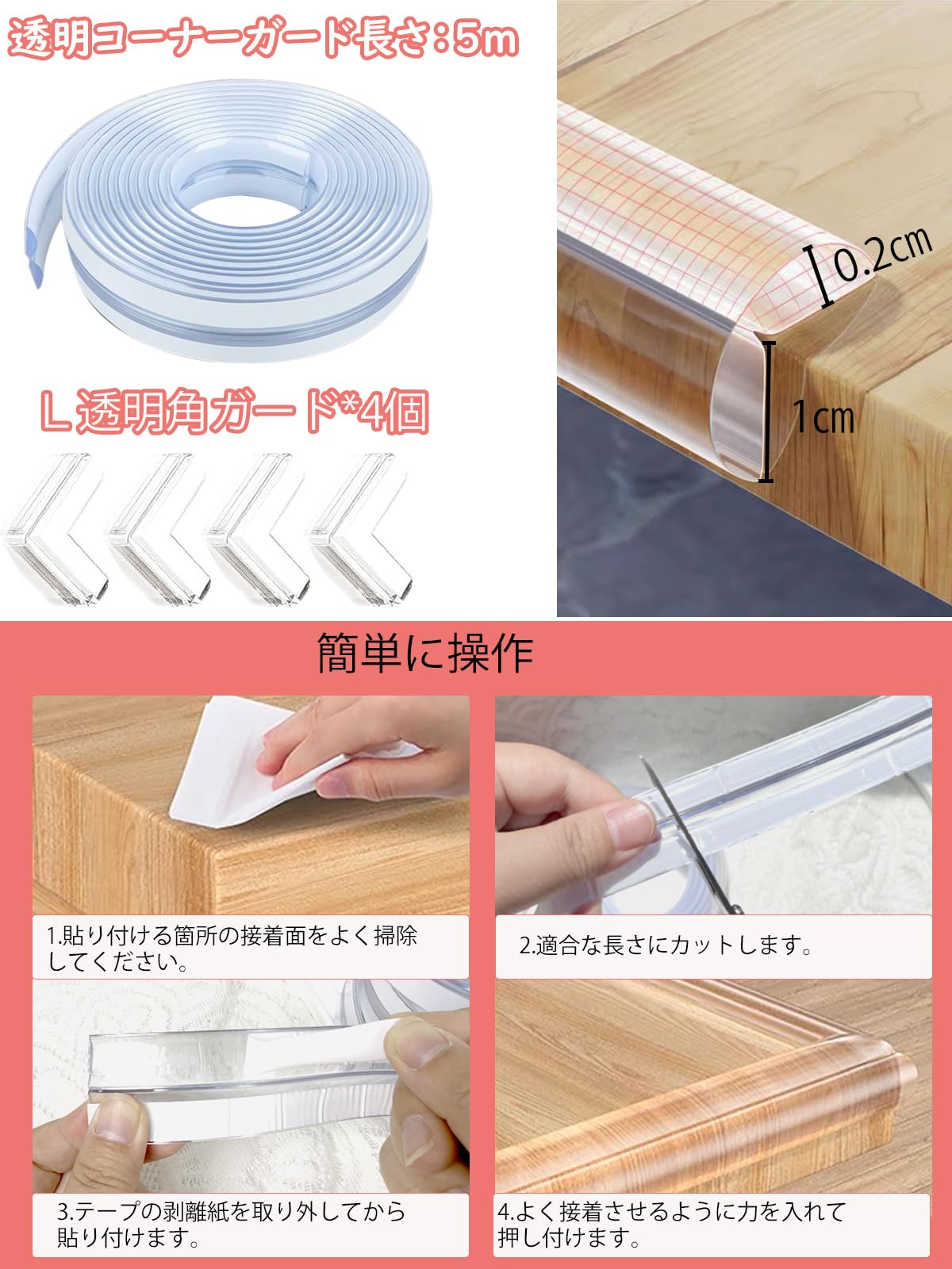 【製品仕様】透明コーナーガード: 5M×1cm×0.2cm, コーナーガード: 4cm×1.5cm×0.5cm×4個 改良版の透明コーナークッションで両面テープは製品本体に貼りました、装着時間が大幅に短縮し、もっと便利になりました。クッション性が高くて、万が一子供がぶつかっても全然平気です。