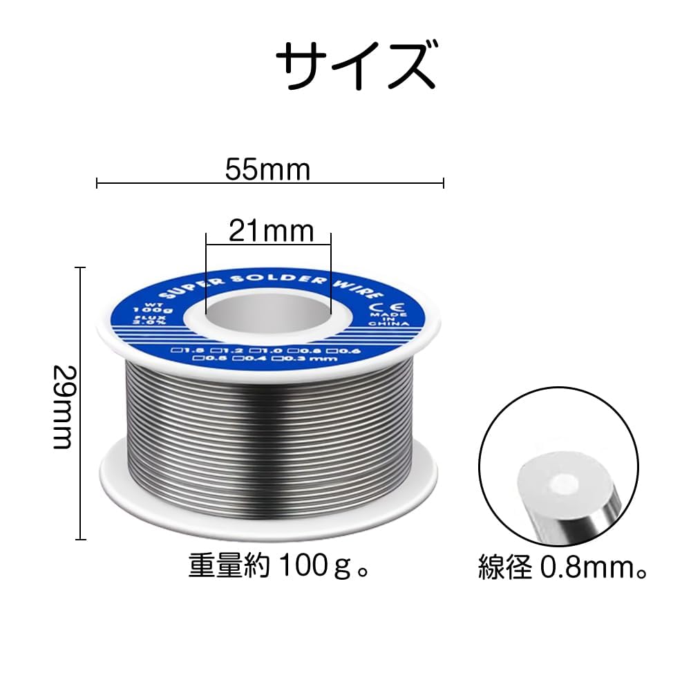 商品仕様:ワイヤーはんだ*1巻。融点:183-245℃。線径:0.8mm。重量:100g。