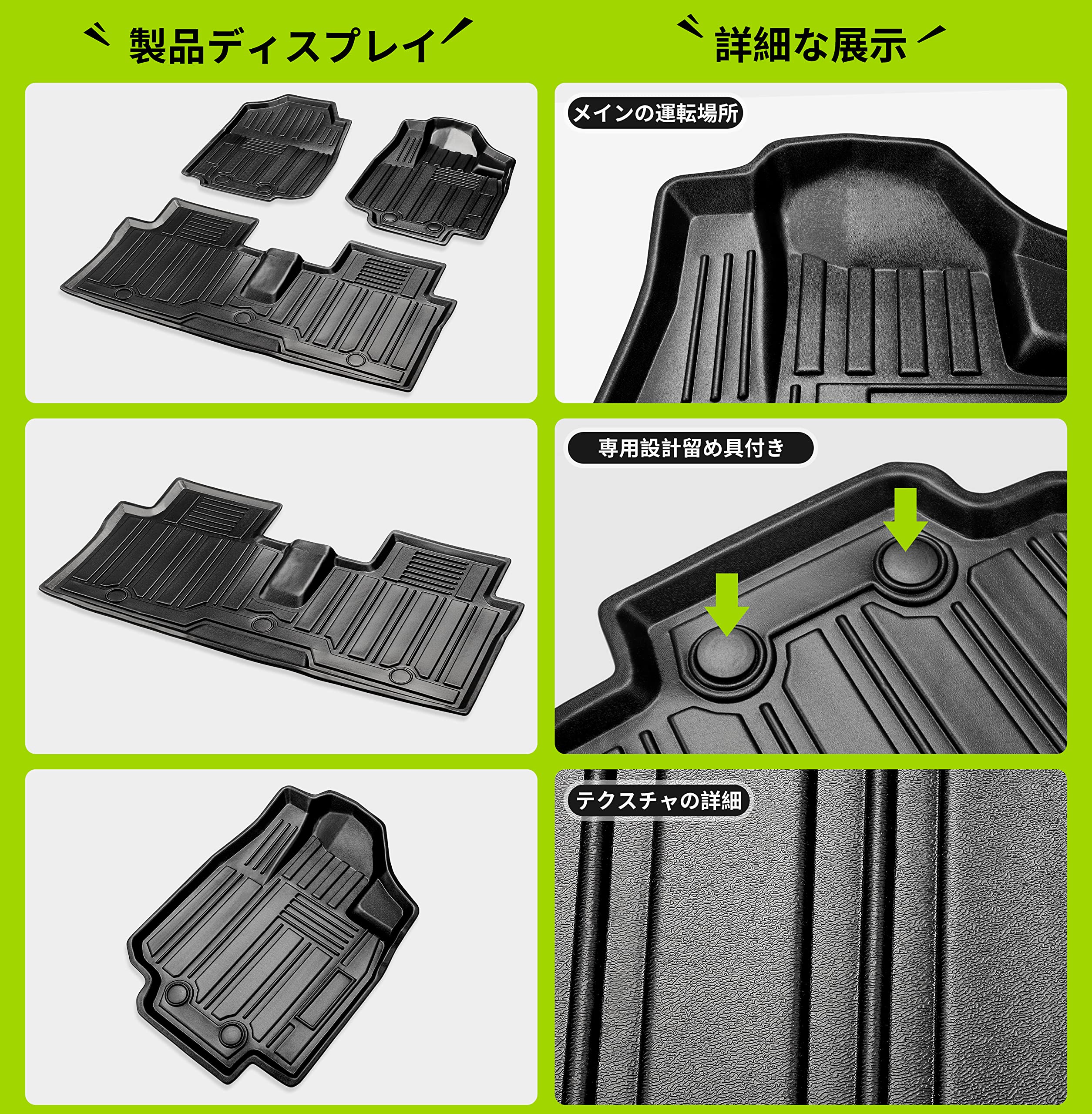 【取付簡単】:留め具裏側にズレ防止加工済み、マットをしっかりと固定し、ドライブの安全性を高めました!ネジや両面テープを使わずに、簡単に装着と脱着ができるし、到着後すぐに取付できます。※注意事項※:製品の包装が折りたたみ式で梱包されているため、到着後にお湯やドライヤーなどで暖めれば元の状態に戻ります。