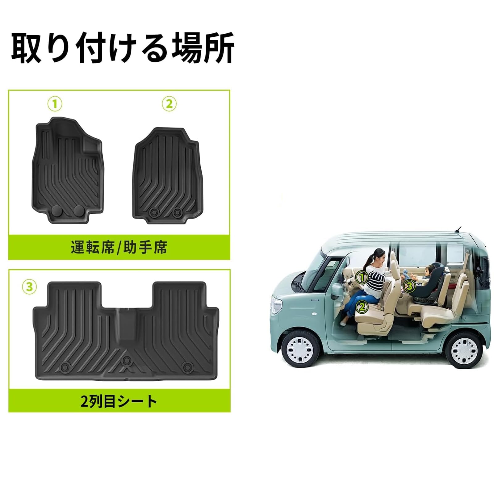 【適合車種】:新型 スペーシア カスタム ギア(すべてのバージョン)。年式:2017年12月〜現行(H29.12-現行)。【セット内容】:運転席用1P、助手席用1P、二列目用1P(3Pセット)。※軟質ゴム製のノンスリップマットが含まれています。※購入する前、形状、年式とモデルを確認してください。