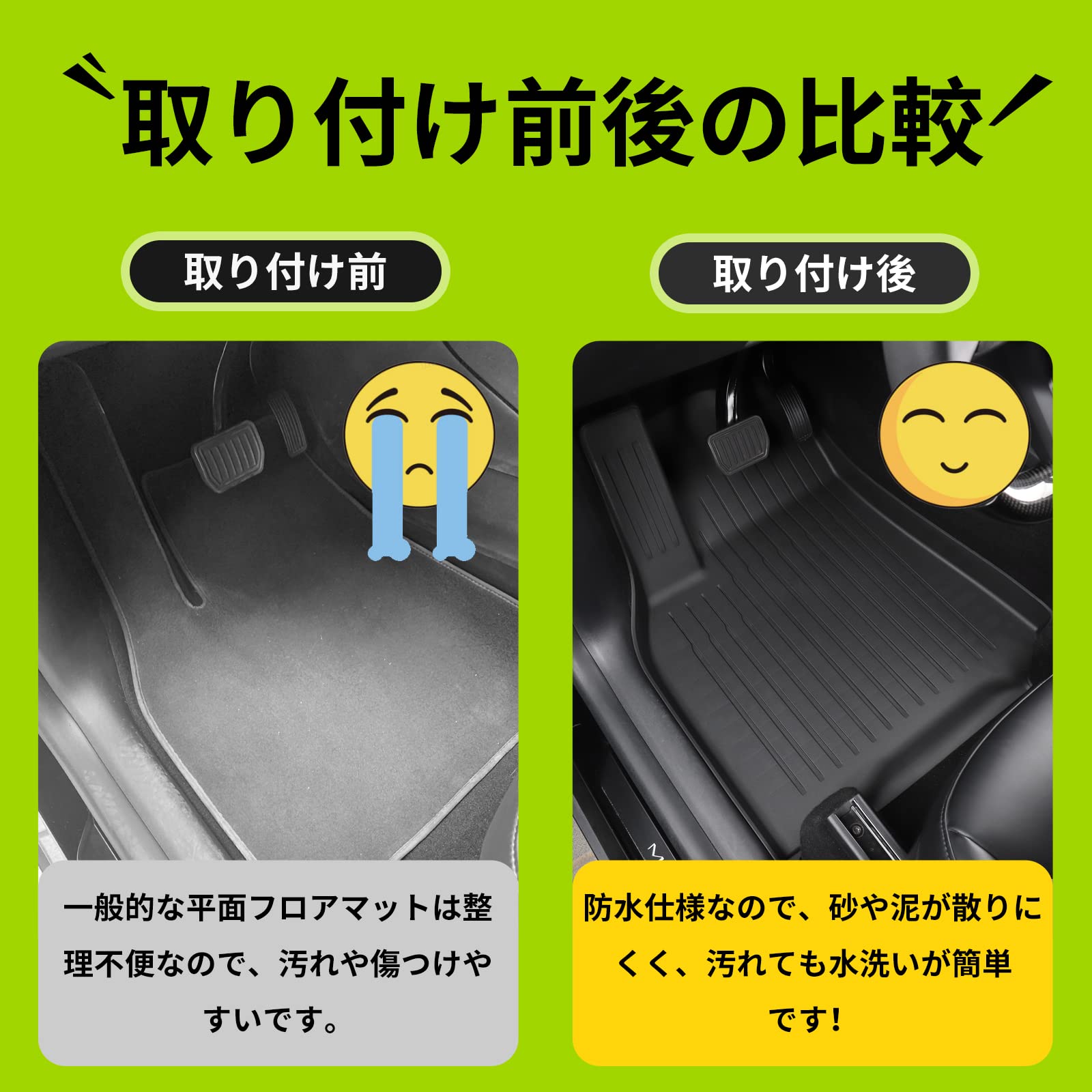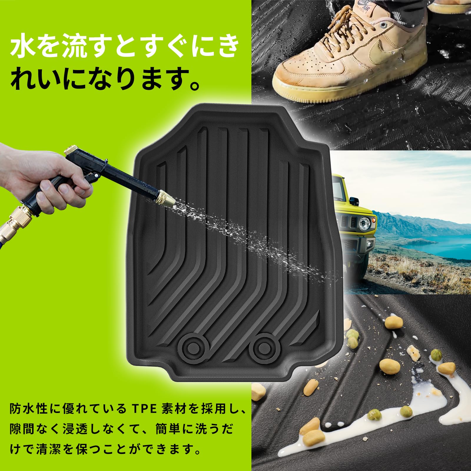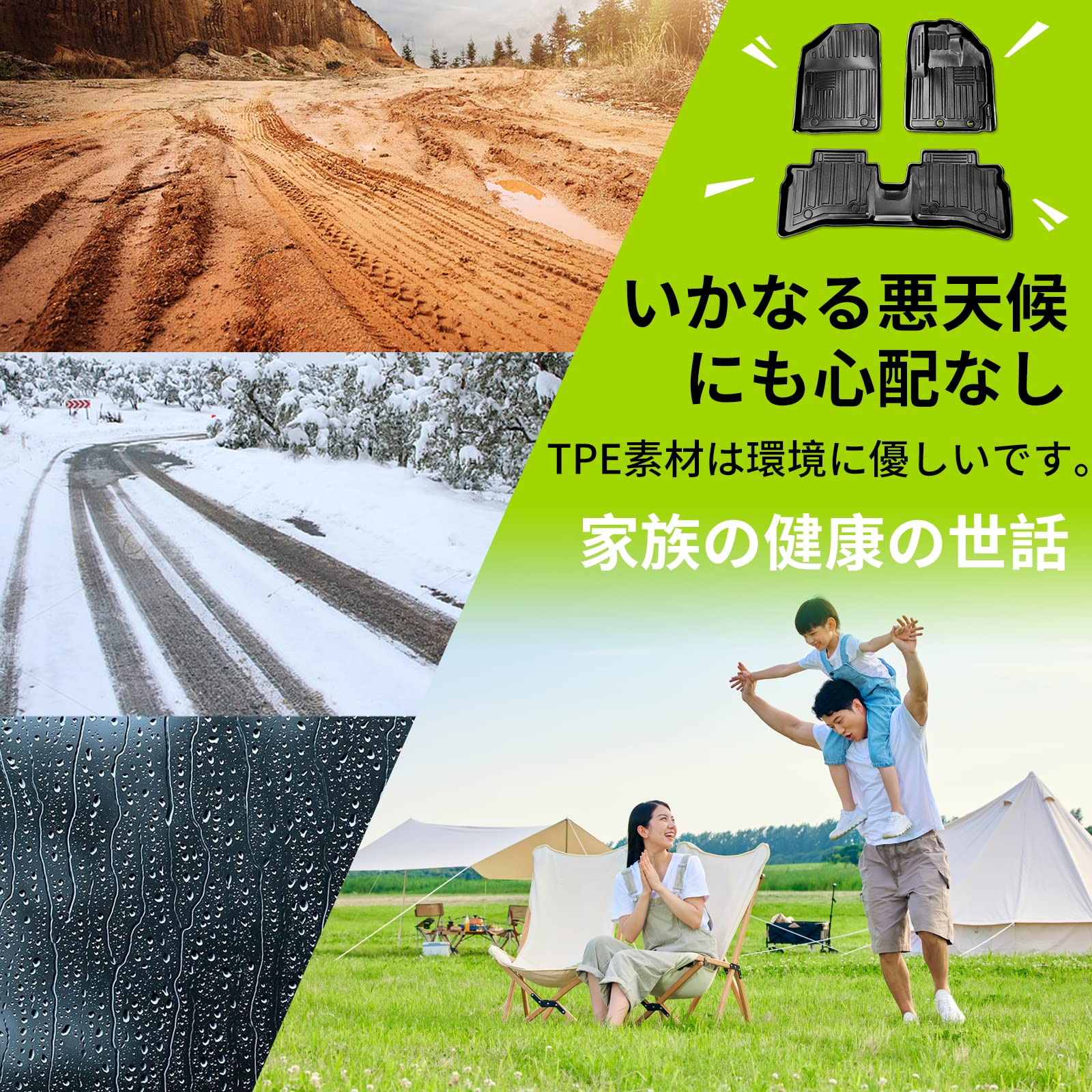 【3D立体構造・防水仕様】3D立体構造なので、縁部分が高めて作られ、水や汚れの侵入を防ぐことができ、耐汚れと防水性を実現しました。万が一水やジュースなどの飲み物がこぼれてもフロアマットの外への侵入を防止します。サーフィンや海水浴・スキーなどのアウトドアシーンや部活や習い事の送り迎えなどで活躍します。アウトドアが好きな方にオススメ、ぜひ体験してみてください。