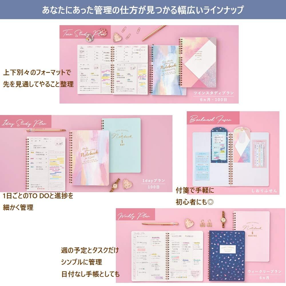 スタディプランシリーズは、つらくなりがちな勉強の進捗を管理してモチベーションを上げたり、結果を記録して自分の強みや弱みを分析し、次に活かす勉強用アイテムを揃えたシリーズです。