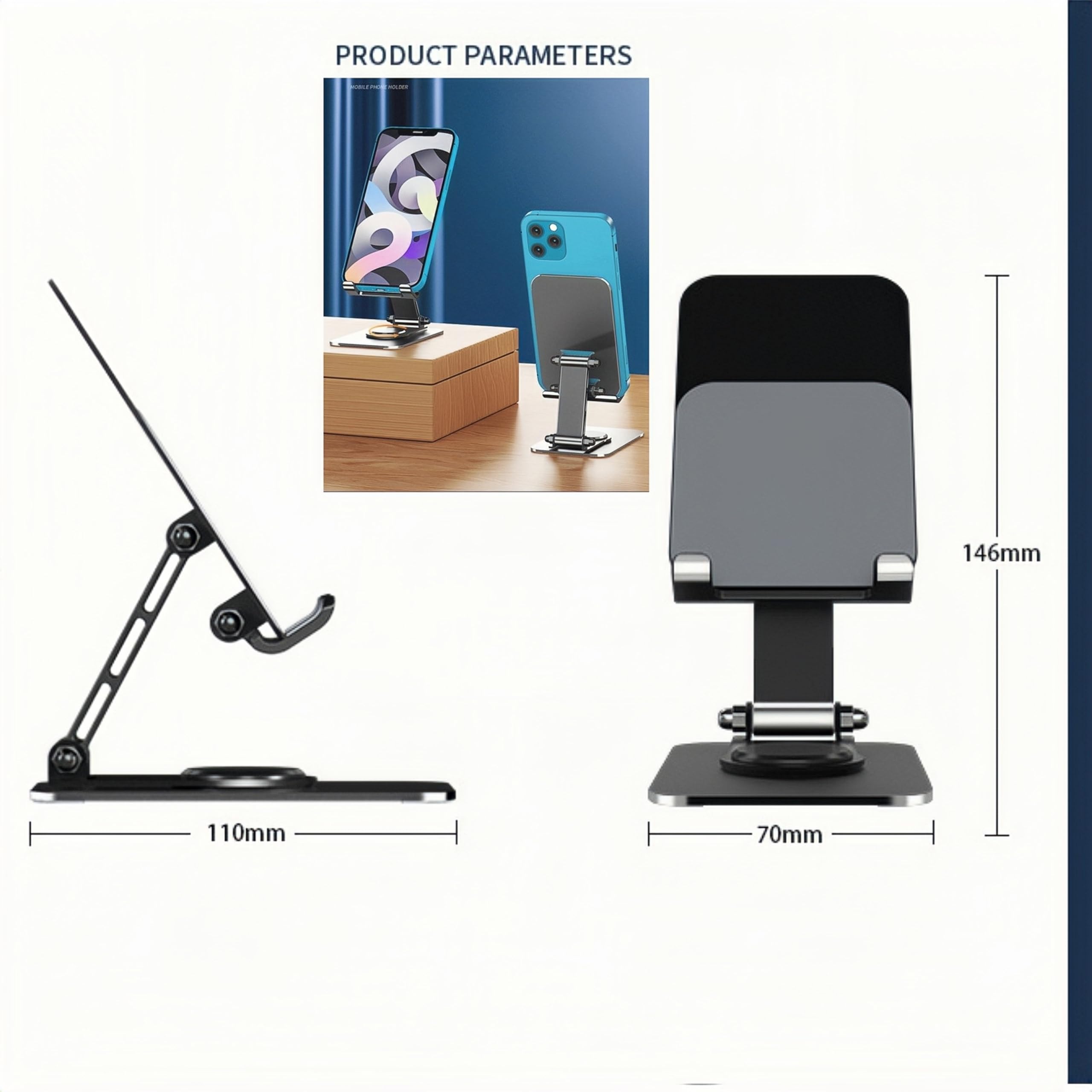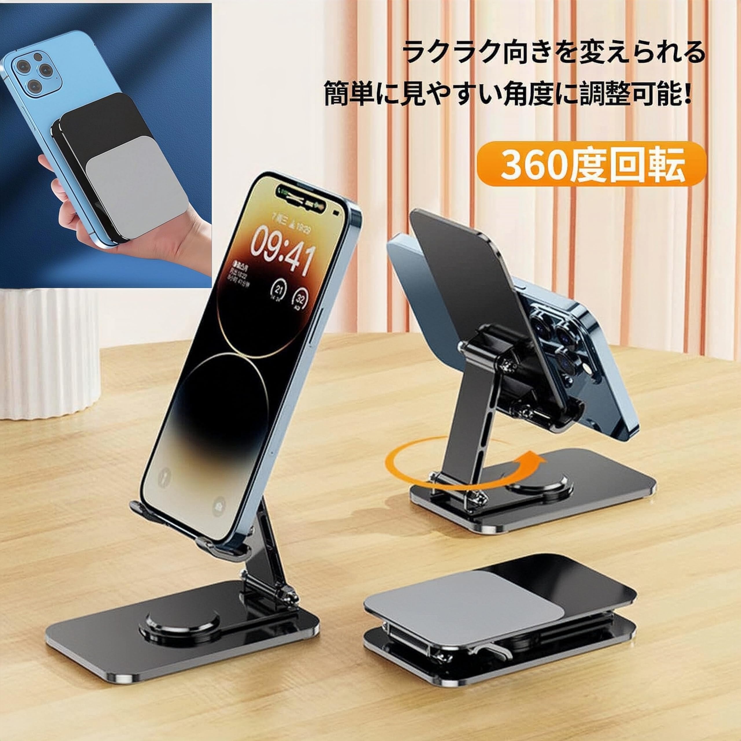 スマホスタンド デスクトップ 折りたたみ 滑り止め 携帯用スマホスタンド 360度回転 高さ角度調整可能 iPad対応 折りたたみ式 スマホ立て 滑り防止設計 デスクトップマグネットスタンド 移動式スタンド for iPhone 16 15 14 Pro 13 12 11 SE iPad Xperia Android対応 水波紋アルミ合金 ブラック