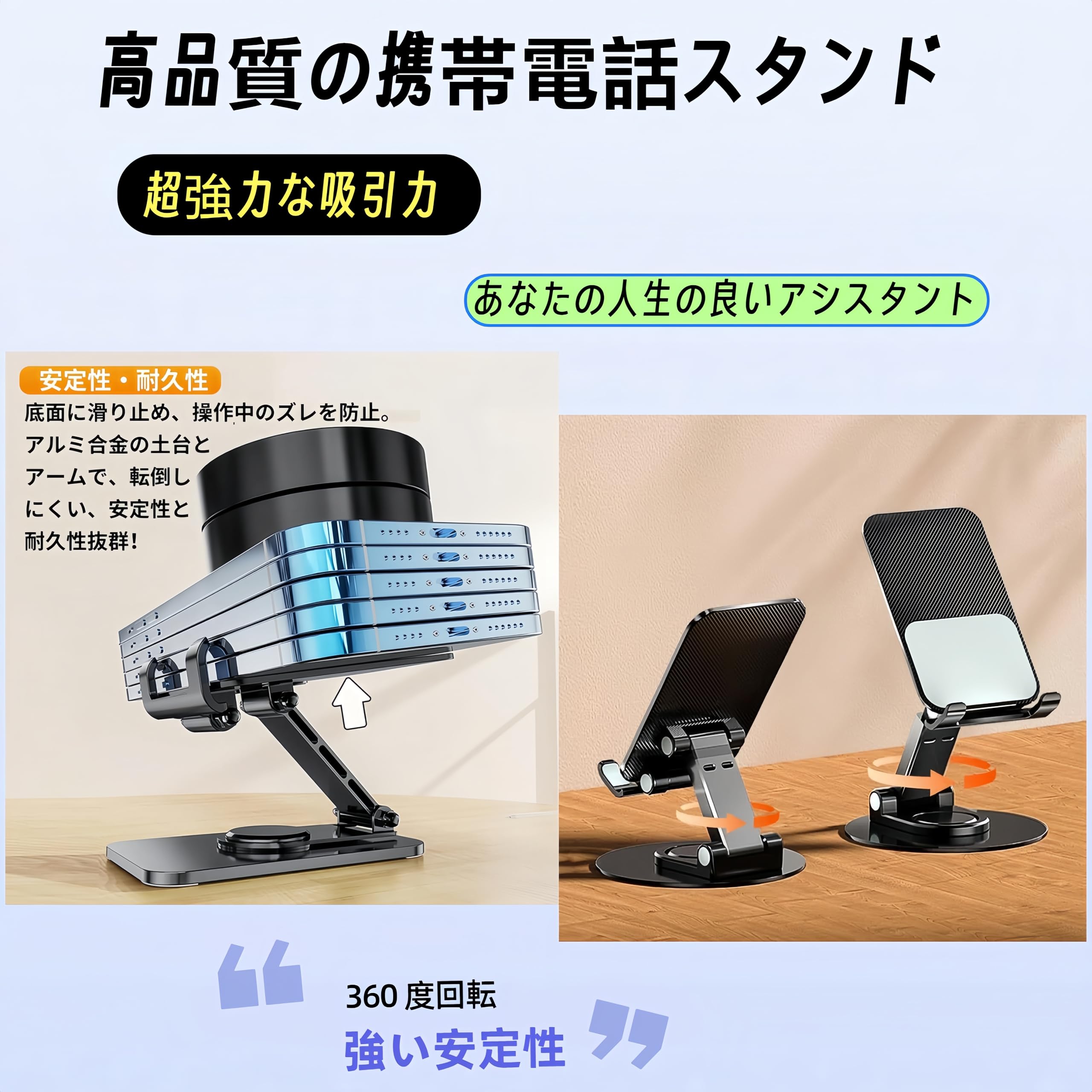 【支えが安定する】丈夫な材質と科学的なサポート構造が組み合わさって、あらゆるサイズのスマートフォンをしっかりと支え、最大音量で再生しても揺れません。あらゆる状況で安定したサポートを提供し、快適な視点を与えます。また、360 度自由回転が可能で、角度を自由に調整でき、さまざまなシーンに対応します。