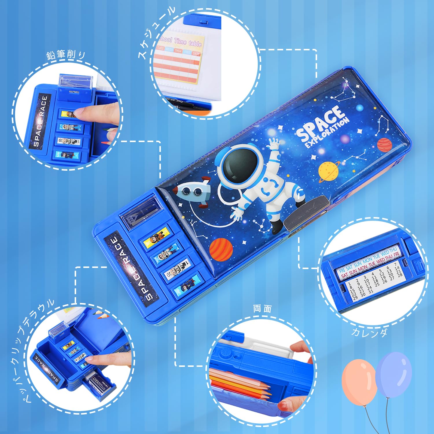 ポップアップ多機能ペンシルケース 女の子と男の子用 かわいい漫画ペンボックス オーガナイザー 文房具 ロック/シャープナー/スケジュール ホワイトボード/学用品 子供への最高のギフト (青)
