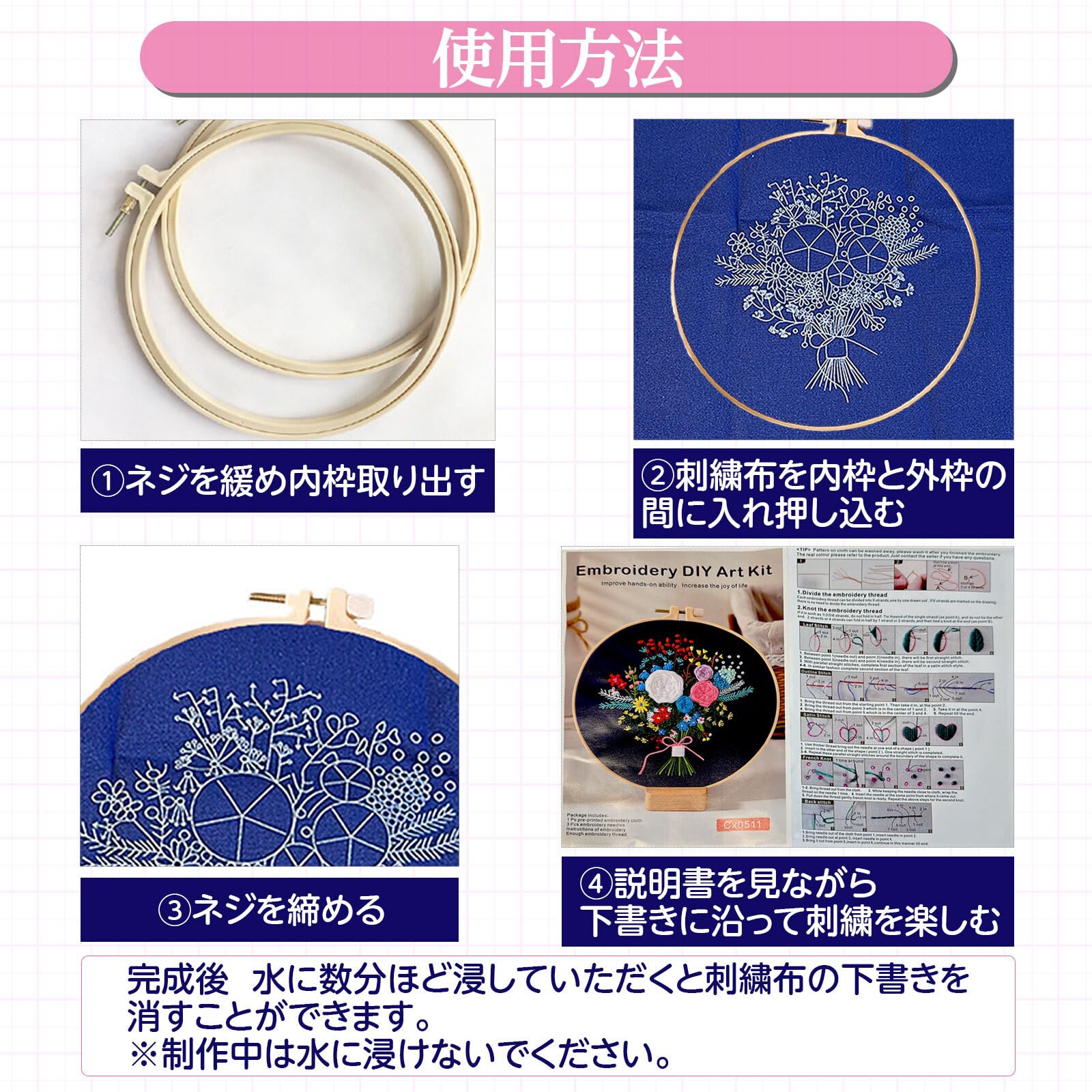 【使用方法】 ①ネジを緩め内枠取り出す ②刺繍布を内枠と外枠の間に入れ押し込む ③ネジを締める ④下書きに沿って刺繍を楽しむ ・完成後 水に数分ほど浸していただくと刺繍布の下書きを消すことができます。 ※制作中は水に浸けないでください。
