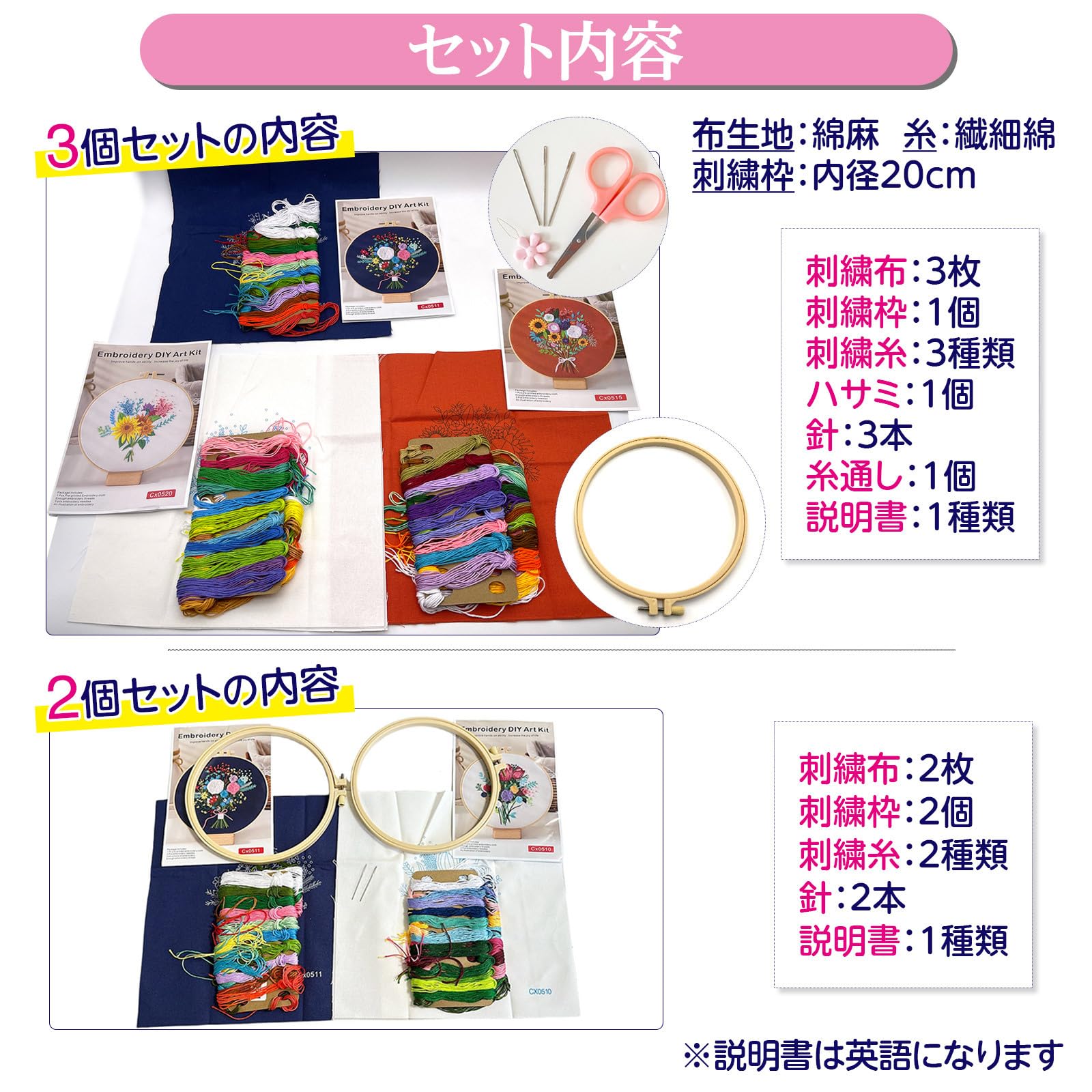 【セット内容】2パターン(刺しゅう布2枚(下書き付き)、刺繍糸2セット、刺繍枠(20㎝)2個、刺繍針2本、英語説明書) ※この製品は素材だけで、未完成品となっております。