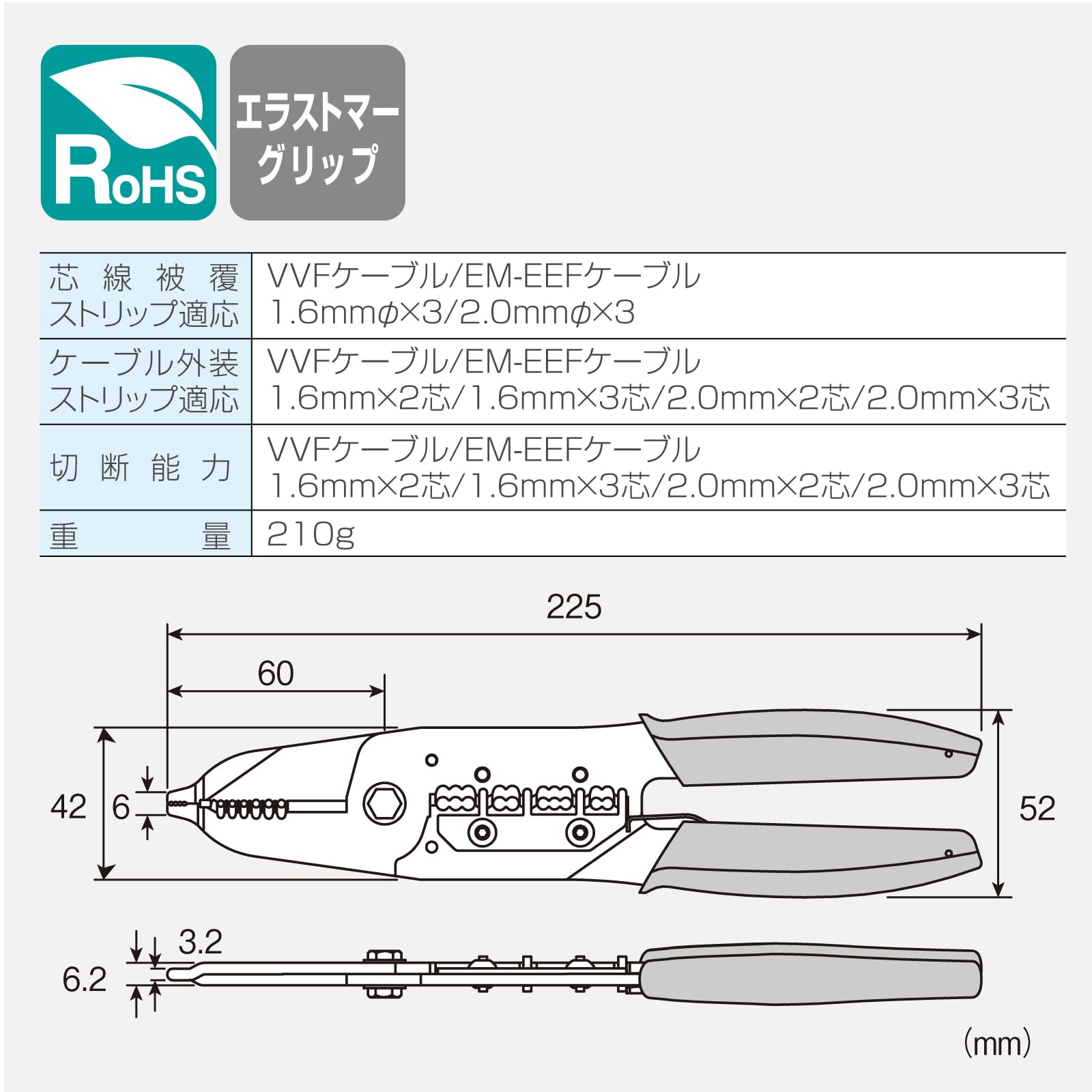 エコ電線(EM-EEFケーブル)も軽い力でストリップ可能