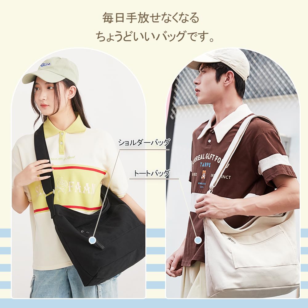 【男女兼用なショルダーバッグ】毎日使いたくなる男女兼用なキャンバストートバッグが登場!肩紐が調整できます。ショルダー部分が太いので、肩の食い込みが軽減されます。肩にかけたり、斜め掛けにしたり、いろいろな持ち方ができます。