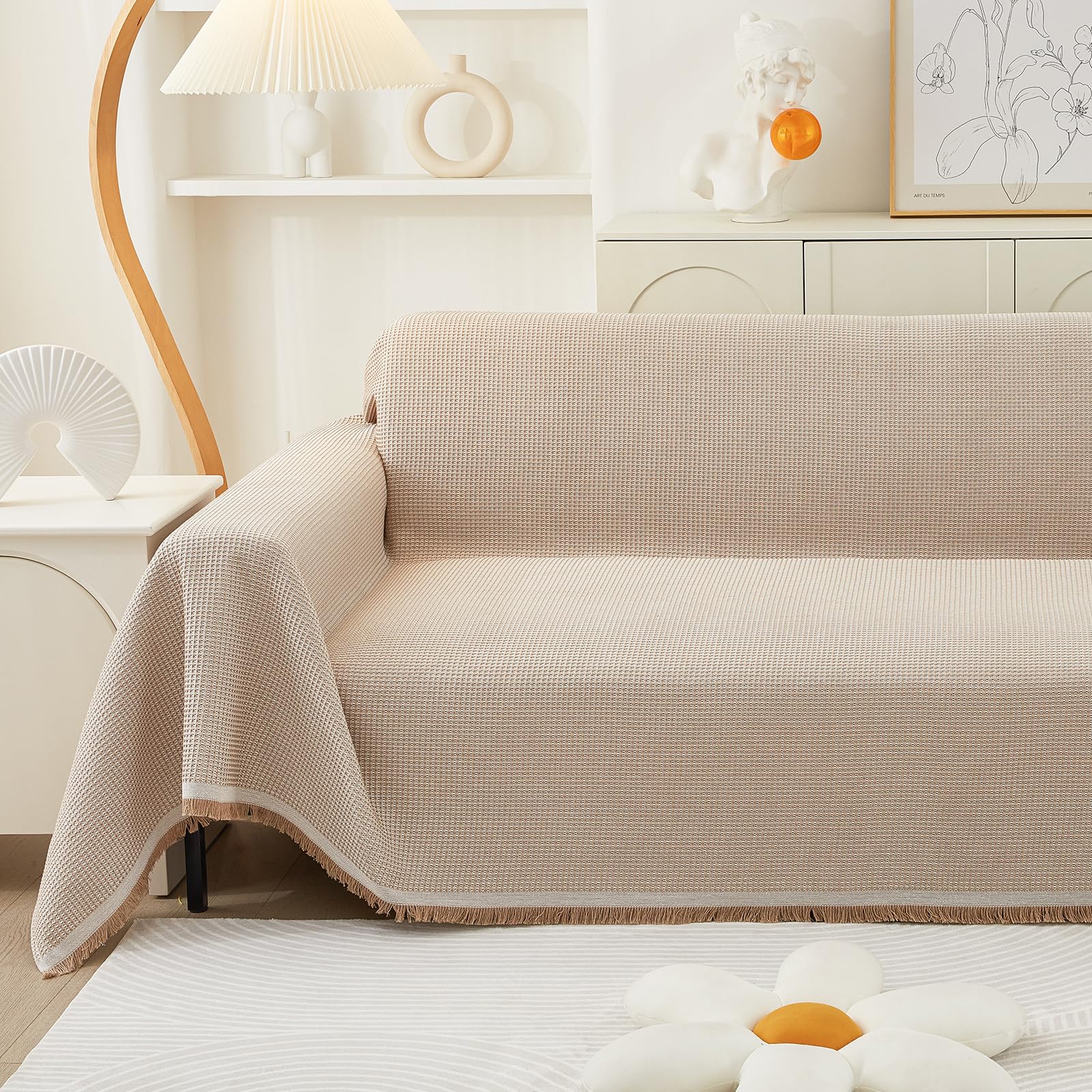 JEMAジェマ ソファーカバー 北欧風 マルチカバー テーブルクロス ソファカバー ベッドカバー 長方形 ブランケット 綿混 リバーシブル 毛布 無地 保護カバー 防塵 キズ防止 汚れ防止 洗える 四季通用 ベージュホワイト・ワッフル柄 300×180cm(3人掛け)