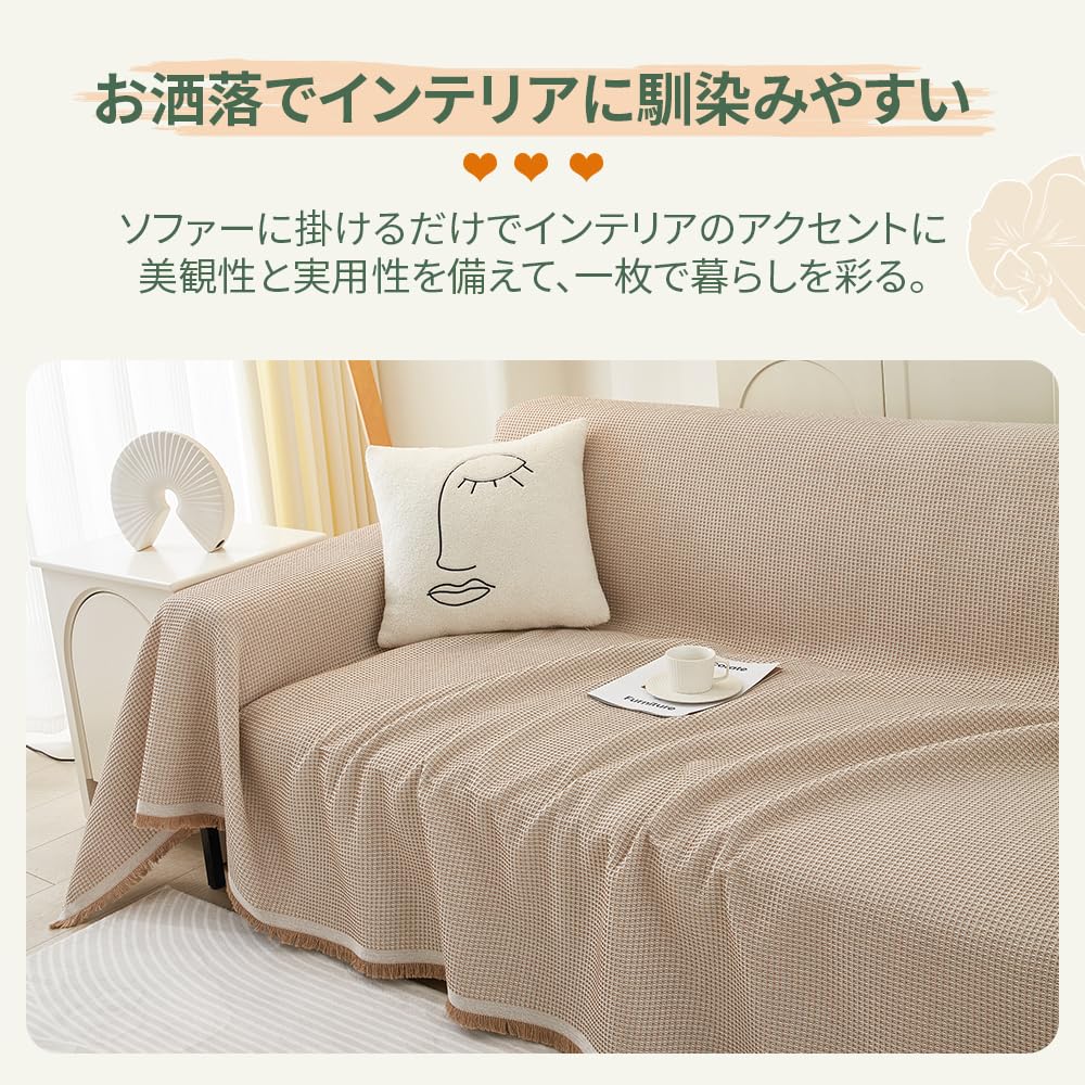【在庫のみ】JEMAジェマ ソファーカバー 北欧風 マルチカバー テーブルクロス ソファカバー ベッドカバー 長方形 ブランケット 綿混 リバーシブル 毛布 無地 保護カバー 防塵 キズ防止 汚れ防止 洗える 四季通用 ベージュホワイト・ワッフル柄 300×180cm(3人掛け)