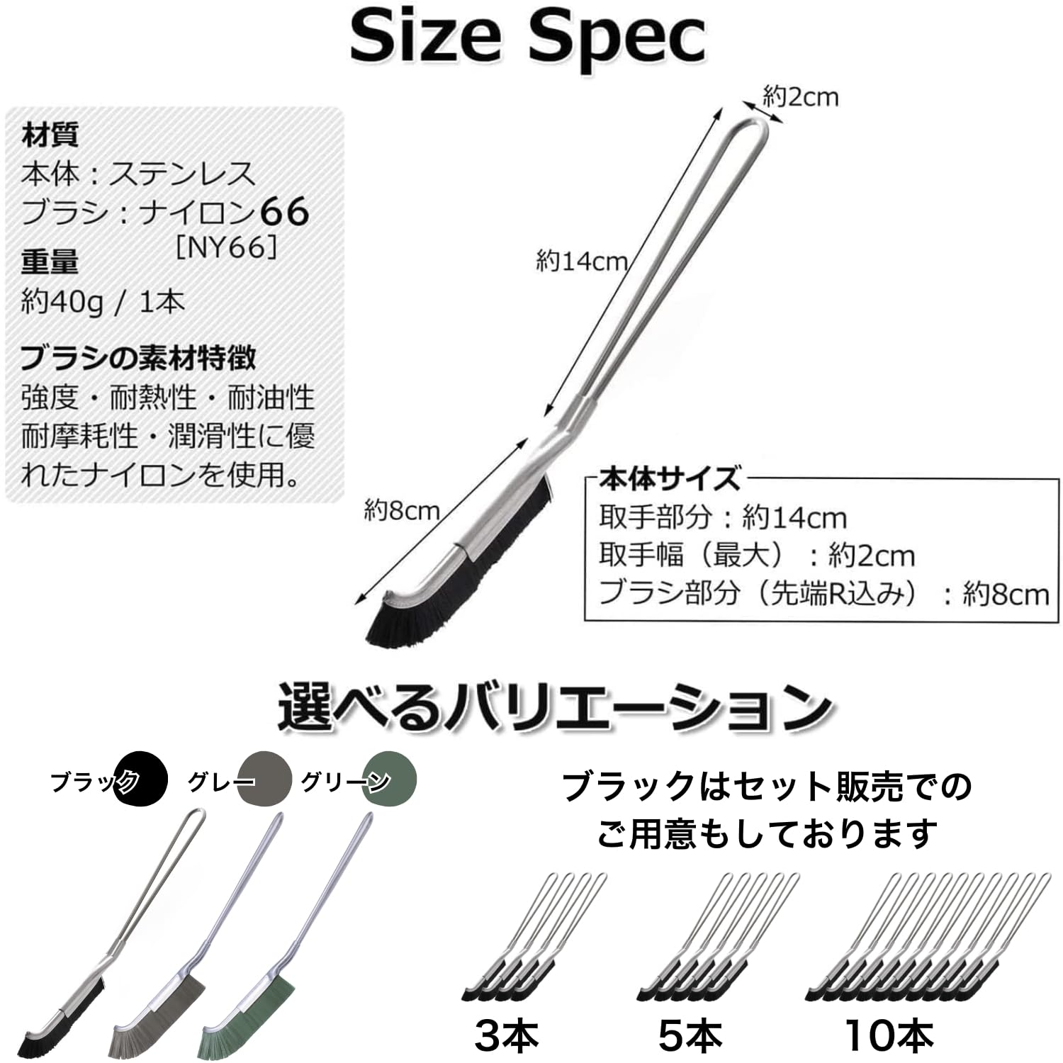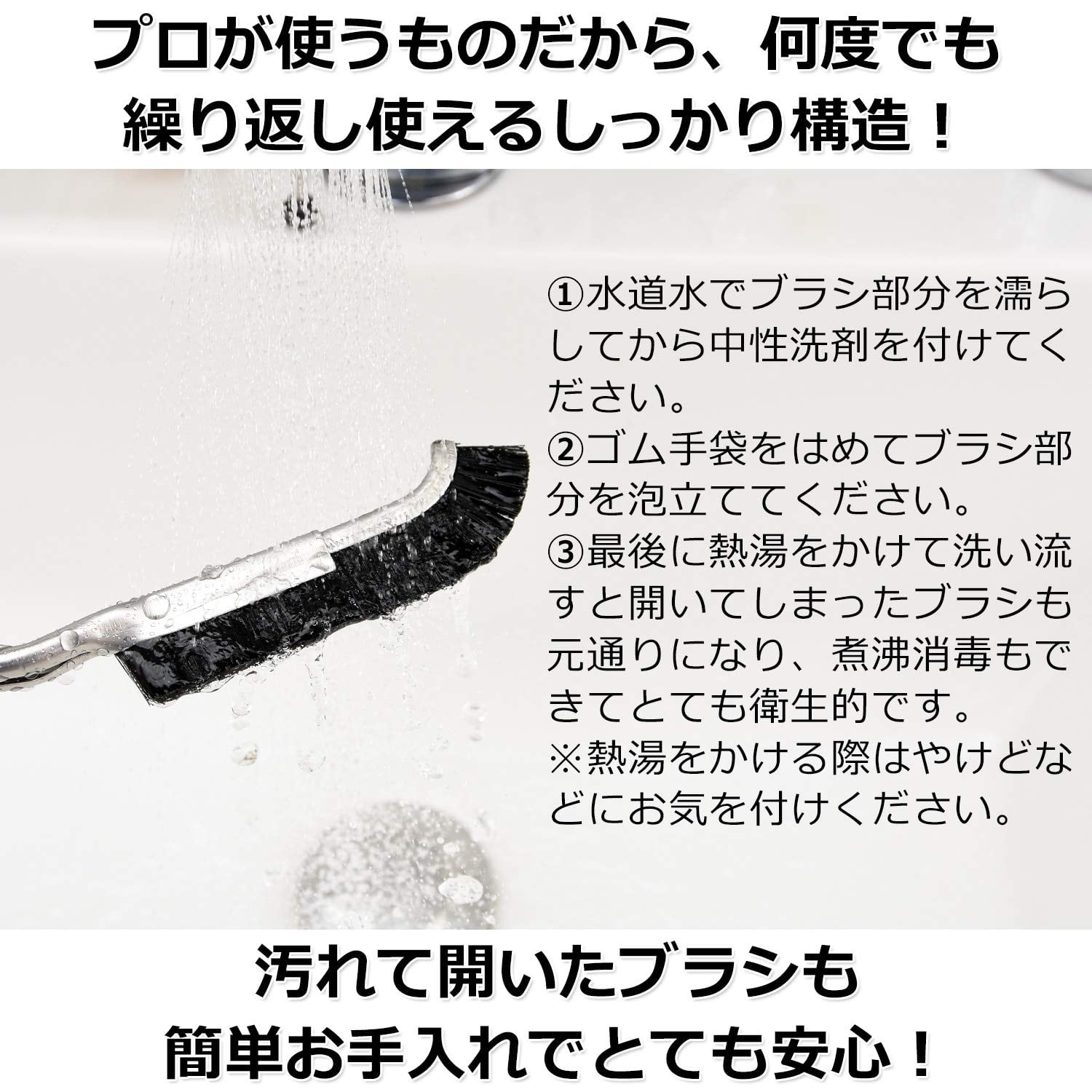 ?【大成工業ブラシのこだわりと特徴】?本体はステンレス製でさびにくく丈夫な作りになっております。?力を加えやすいように指ストッパーが付いており握りやすくなっています。?細かい隙間や角にブラシの毛が届くように設計された、Jの字のようなカーブをした先端になっております。?汚れを落としやすく、お掃除場所を傷つけにくい適度な硬さのナイロン毛「ナイロン66」(NY66)を使用しております。?耐熱性があり、油汚れ等はお湯を使ってご使用いただくことが可能です。