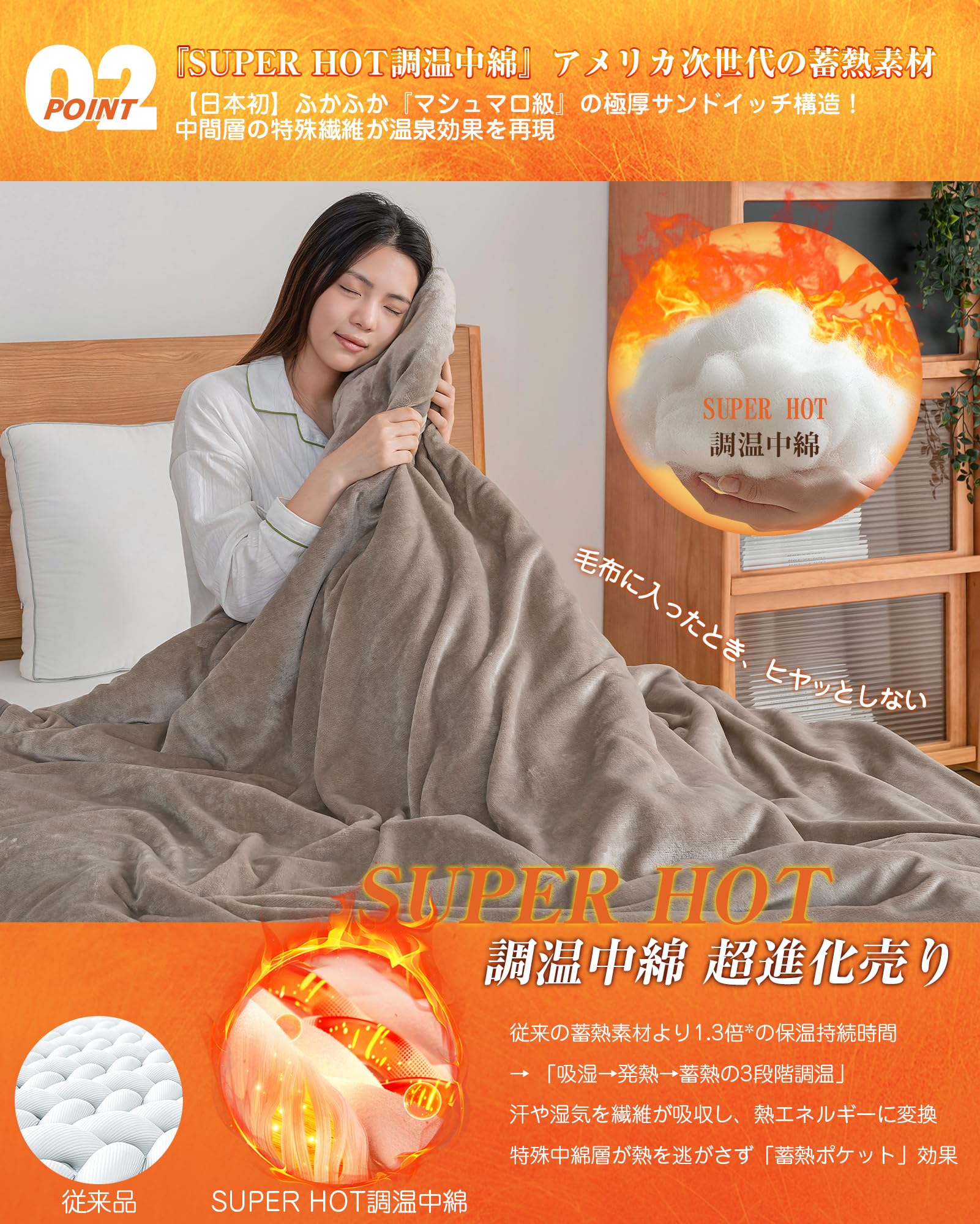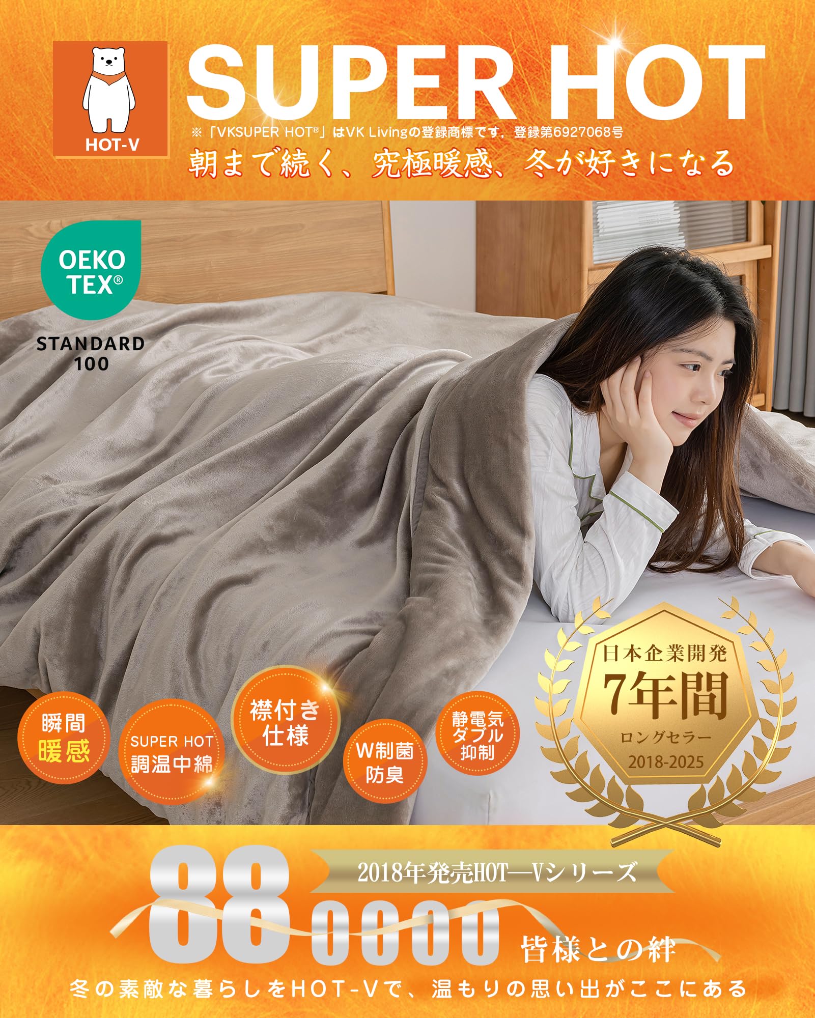 ??【未来の魔法瓶毛布・快適な温度が長〜く続く!】①魔法瓶効果かつ瞬間超発熱の「扁平糸」超高密度フランネル+②VK Livingが独自に開発したSUPER HOT調温中綿+③保湿加工を施したフランネルで、2025年の新技術により創造したこだわりの魔法瓶毛布です。秋から春まで長期間使用でき、季節の変わり目にも重宝します。
