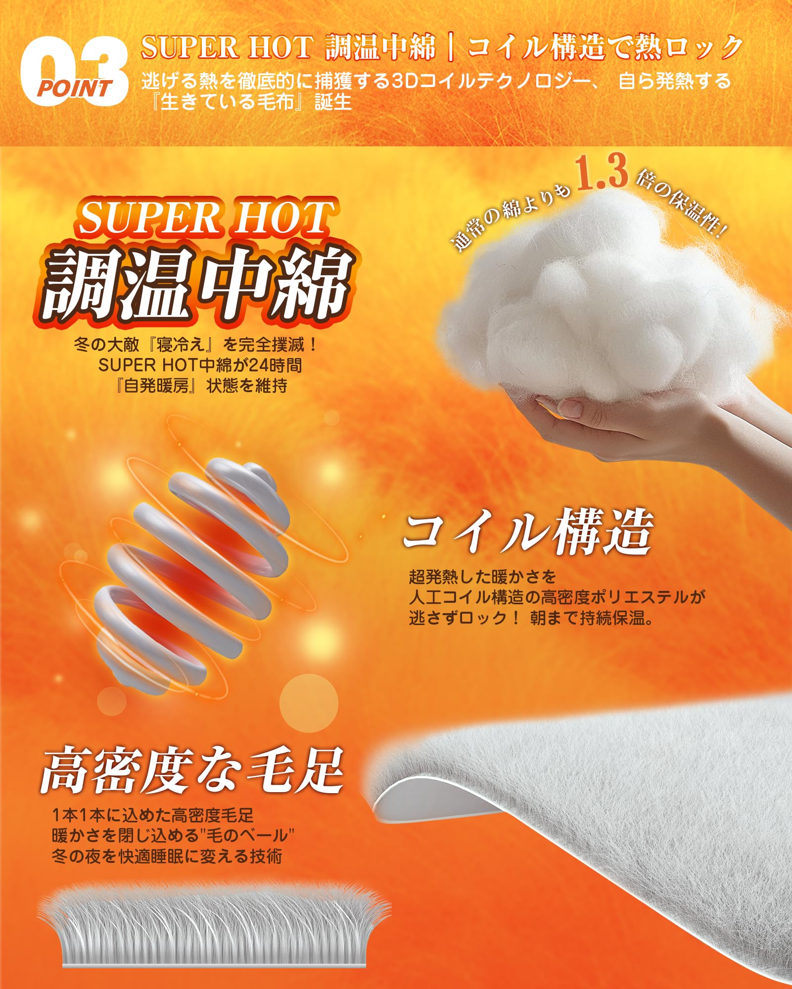 ??【SUPERHOT 次世代調温中綿】アメリカ発の蓄熱素材が、日本初上陸!「吸湿→発熱→蓄熱」の3段階で温度をキープ。汗や湿気を素早く吸収し、熱エネルギーに変換。特殊中綿層が“蓄熱ポケット”となり、従来素材より保温時間が1.3倍もアップ!マシュマロのようにふかふかな極厚サンドイッチ構造で、温泉のようなほっこり温もりが持続。暖かさと快適さがとことん進化した、新次元の保温体験を。