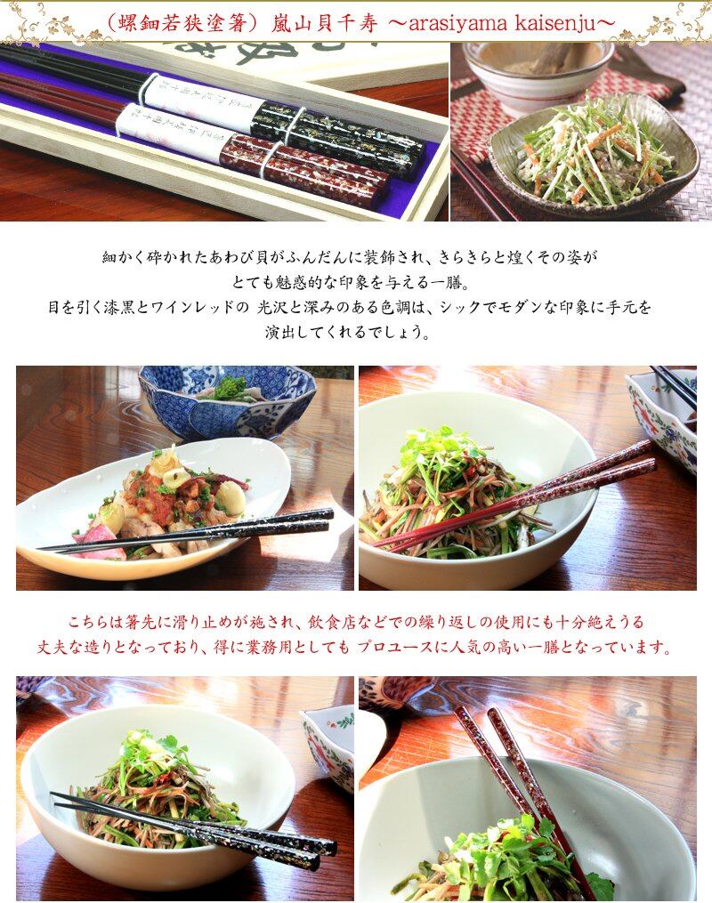 ◆京都の北部に位置し、古くは江戸の時代から京料理の膳を彩り続ける若狭塗箸は、京都各所の(割烹・料亭・名士層)の引きあいに併せて造られた 様々な華飾のデザインが存在します。 その伝統的なデザインを現代風にアレンジ・復刻させたものが(山城風月膳/割烹雅膳)のシリーズとなり、京の雅を連想させる若狭塗特有の彩色の妙が楽しめる一膳となっております。 全般に上品な和色が特徴となっておりますので、御自宅にて(ちょっぴり いつもより上質な和の膳を演出したい) そんな風に思われた際は 是非とも若狭塗箸をテーブル上に振舞って頂き、美味しいお料理に舌鼓を打って頂ければ 嬉しい限りにございます。