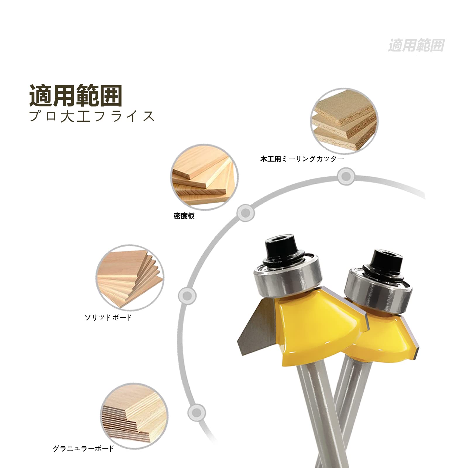このルータービットセットは、DIYでよく使われるサイズを集めたもので、ソリッドウッド、MDF、ラミネート、パーティクルボード、合板コンパクトパネル、アクリルに最適です。ただし、鋼、鉄、砂などの非木材材料には適していません。