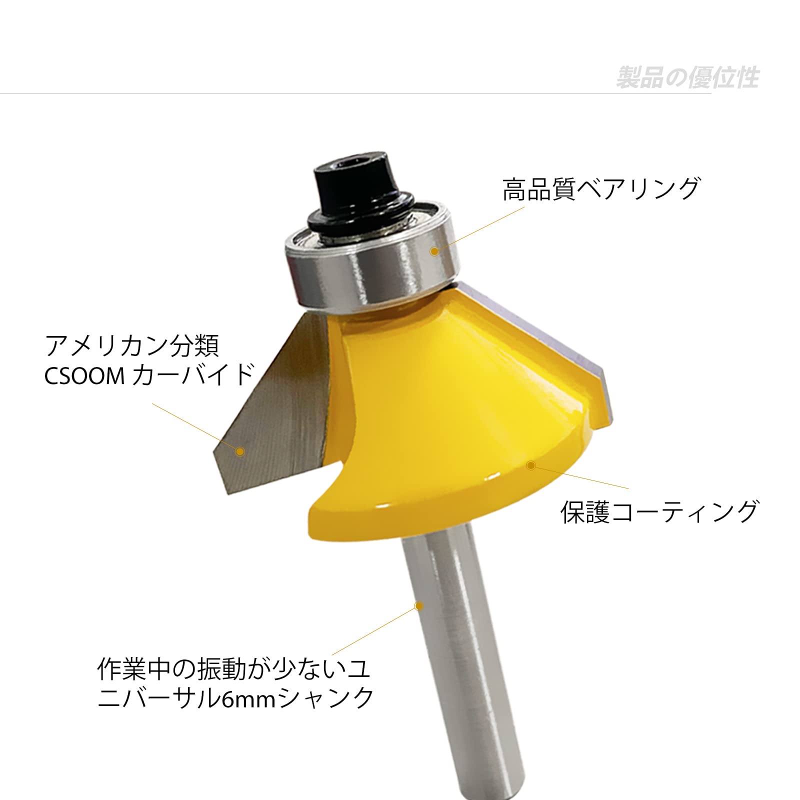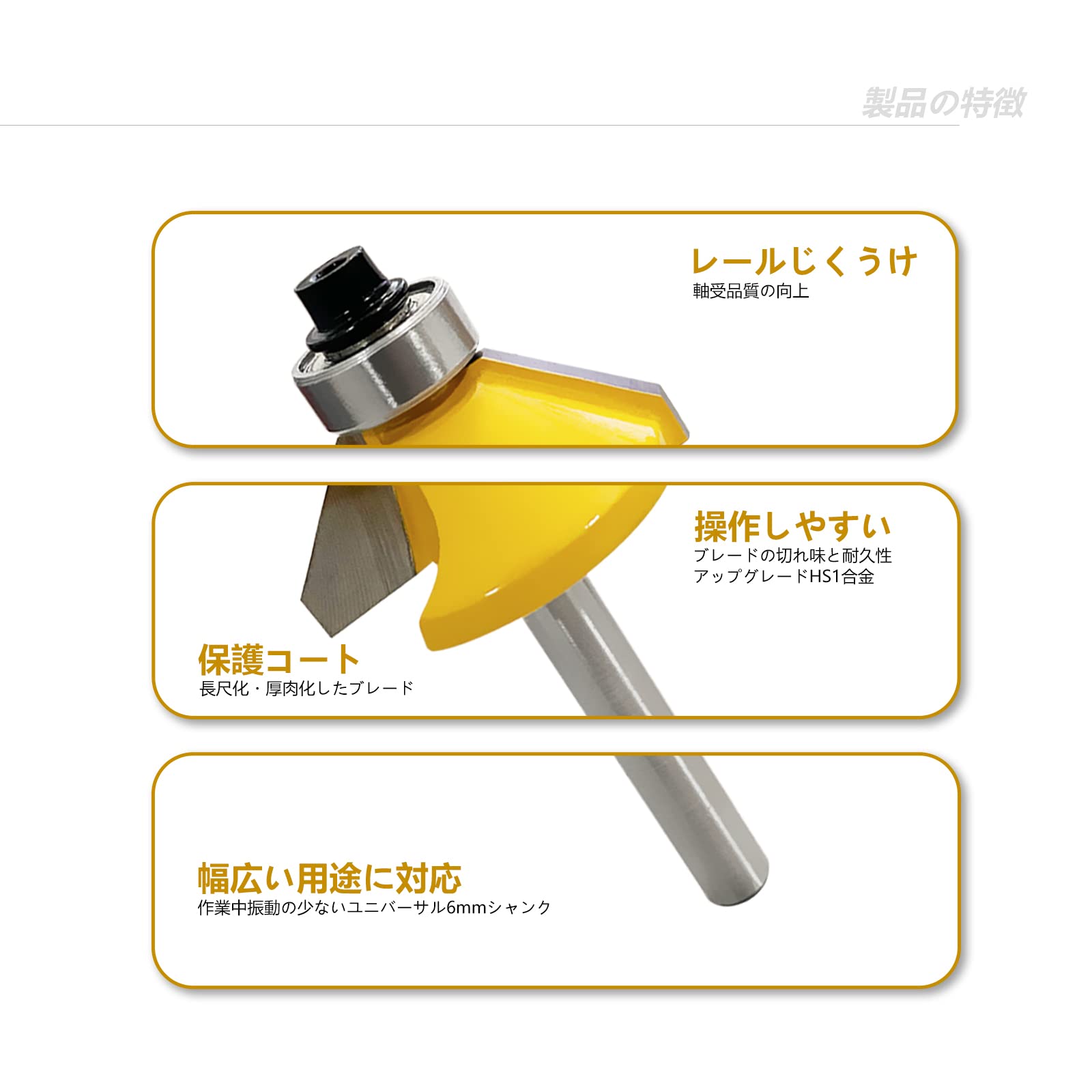 イエローカラーの面取りビットで、シャンク径は6㎜です。HS2合金を採用し、表面には塗装が施されており、切断速度と耐摩耗性に優れています。