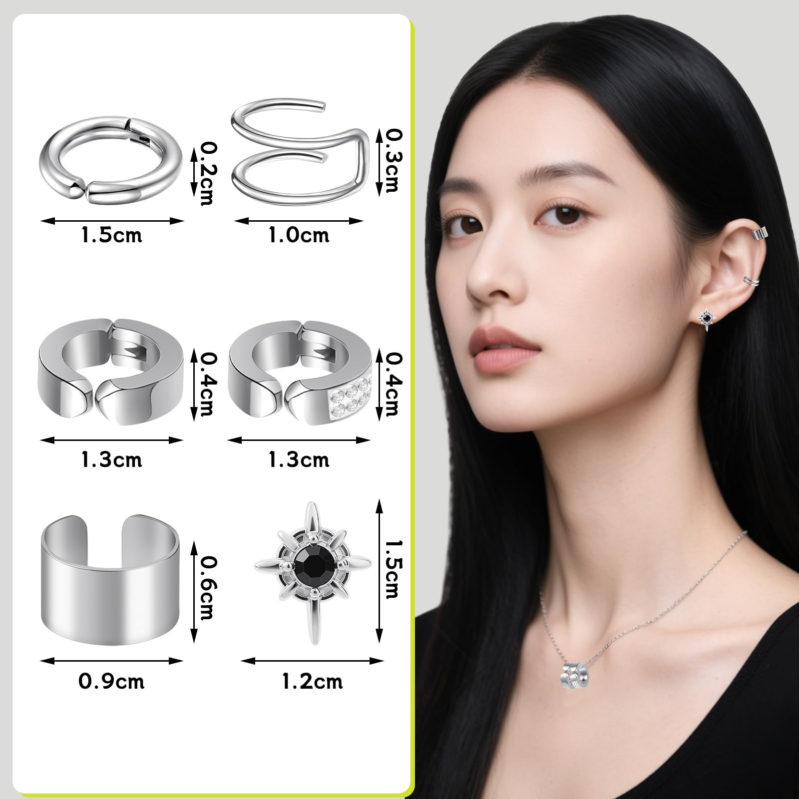 製品内容:パッケージにはノンホールピアス6個あり、デザインは多様です。耳たぶ用4個、軟骨用イヤリング2個、そのうちにマグネット式イヤリング1個があります。豊かな選択から、さまざまな場面、服装、気分に合わせてイヤリング イヤーカフを変え、個性を現わします