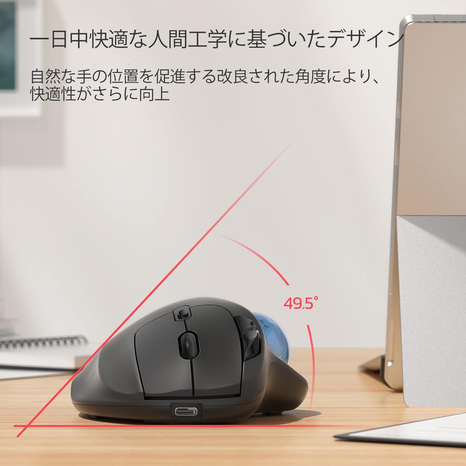 【手首にやさしく、自然なフィット感を追求したエルゴノミクス設計】 手首や腕に負担をかけず、親指でカーソルを操作できるトラックボールマウス。長時間の使用でも疲れにくく、快適さを追求しました。さらに、本体形状は人間工学に基づき、手のひらに自然にフィットするように設計されています。ご注意:手の小さい方にはやや大きく感じる可能性がありますので、寸法をご確認のうえご検討ください。