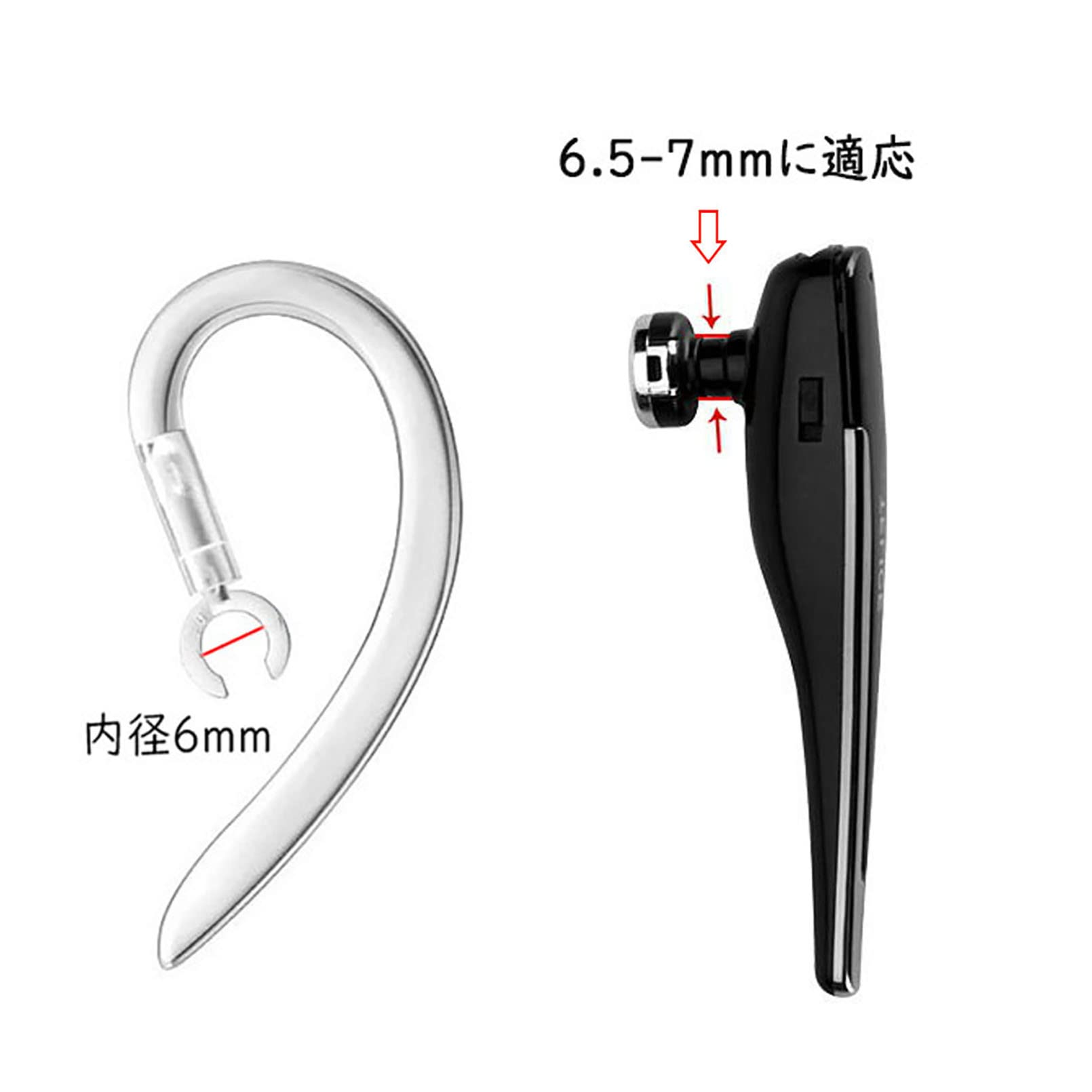 【内容物】イヤーフック*3個。サイズ:6mm(6.5〜7mmのヘッドフォン台座に適応、合わないときはドライヤーで温めて調整することができます)