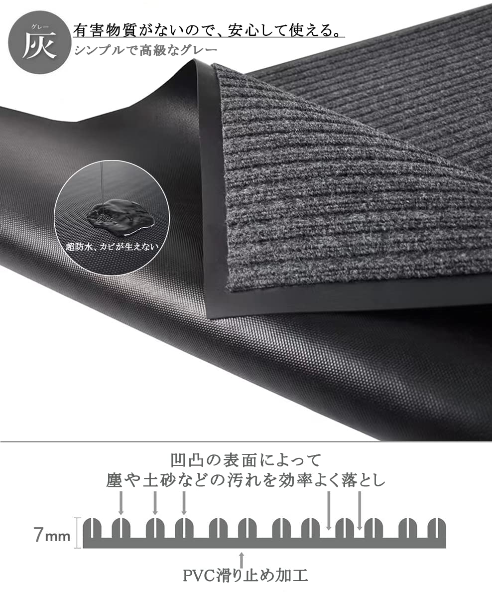【泥落とし、吸水】屋内、屋外でお使いいただける玄関マットです。表面の凸凹が屋内に持ち込みたくないホコリ汚れや水などをしっかり捕らえ、吸収する機能的なマットです。長い梅雨の日でも大雪の日の中でもフロア汚れを最小限に抑えます!また、マットが抗菌性・防臭性、一年中も快適にご使用いただけます