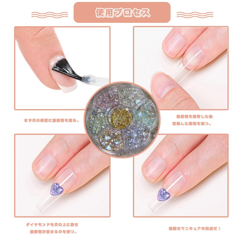 使いやすい:ネイルストーンはナチュラルネイルやネイルチップに使いやすい。人工爪や爪にネイルブラシでナチュラルグルーを塗り、ハートのダイヤモンドの飾りを爪の上に置き、グルーが乾いて硬化するのを待つ、それで十分だ。