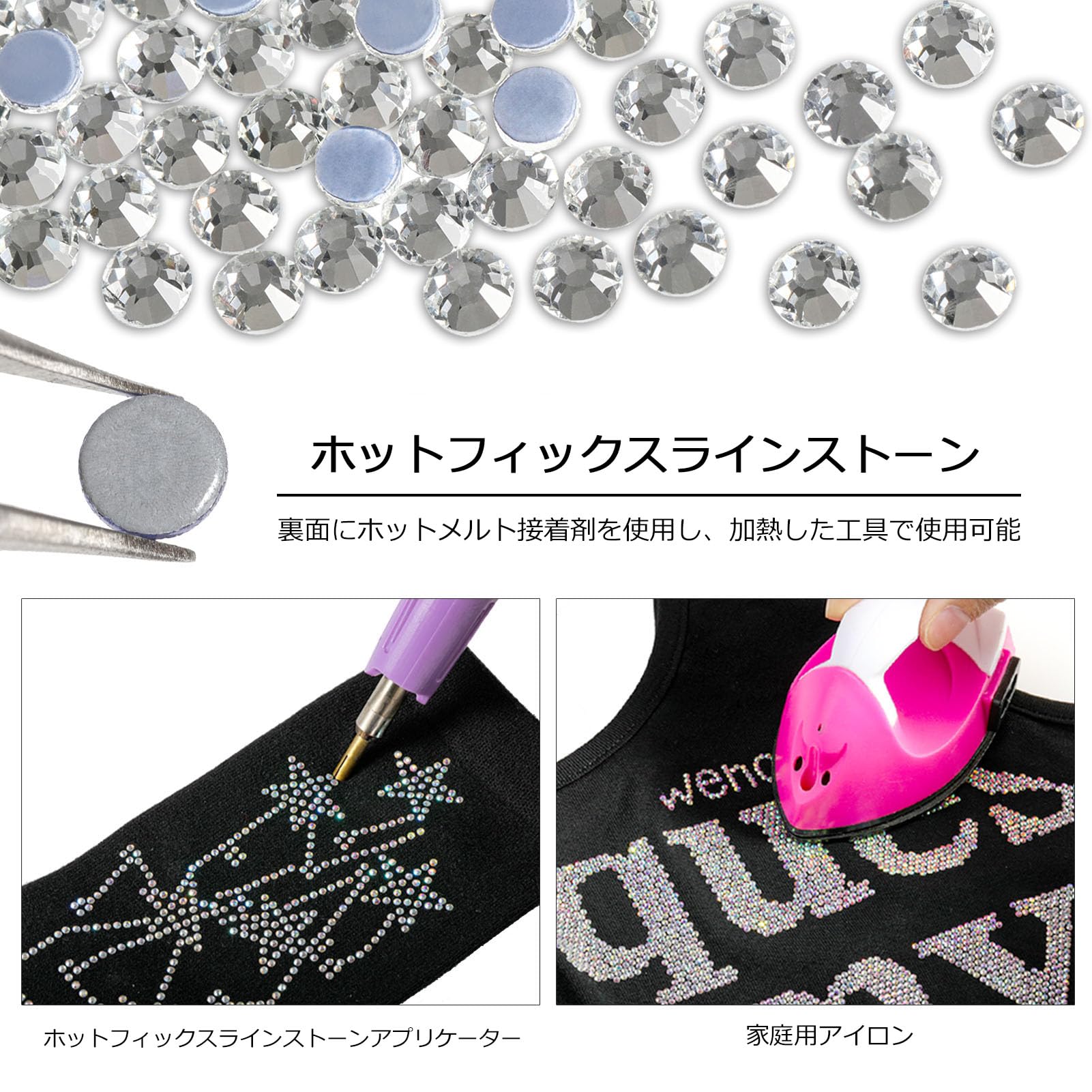 使用は簡単:ガラスラインストーンの裏面にホットメルト接着剤があらかじめ付けられています。フラットバックラインストーンを固定するには、家庭用アイロンまたはホットフィックスラインストーンアプリケーターをご使用ください。熱を加えずに接着剤を付けての使用も可能です。