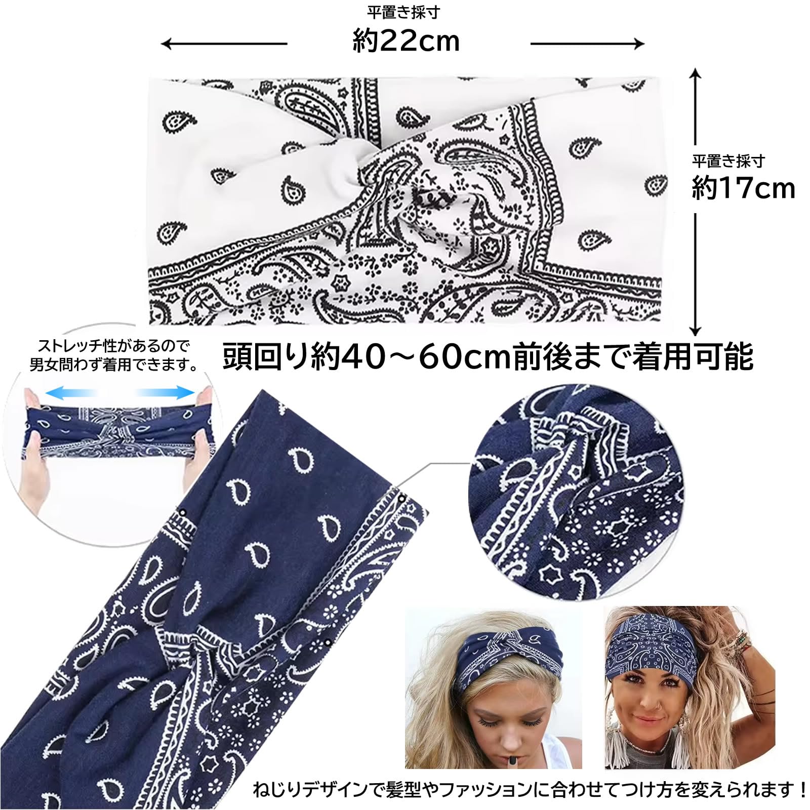 伸縮性: 男女問わず着用可能な高伸縮素材を使用。頭周り約40〜60cmに対応し、快適なフィット感。