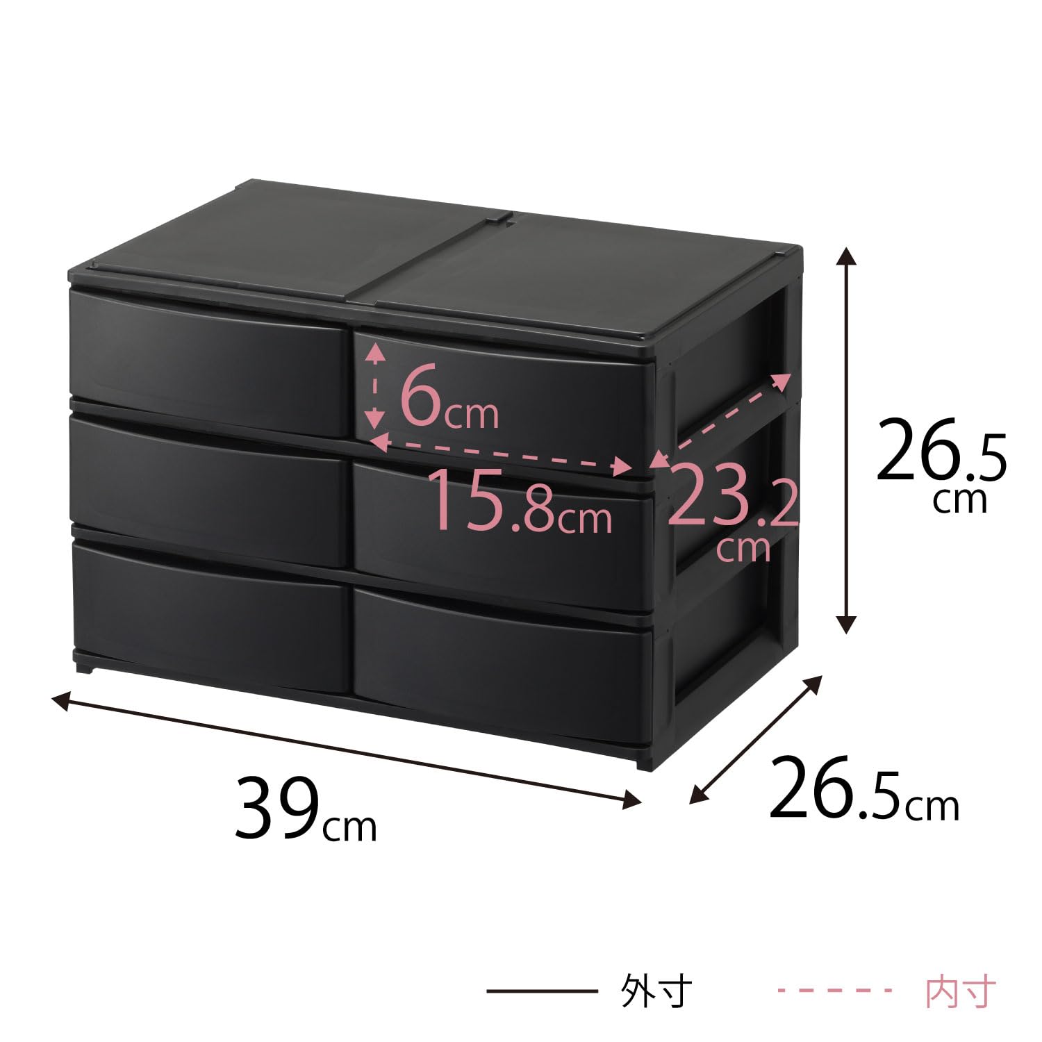 【特価処分】サンカ ポスデコ カラーボックスにピッタリフィット 引き出し収納ボックス ワイド 浅3段(引出し6個) ブラック ずれを防ぐラバーストッパー 重ねて使える スタッキングチェスト ロック機構 日本製 カラーボックス 収納ケース 小物 衣装 ボックス (幅39x奥行26.5x高さ26.5cm) NpdW-EBK