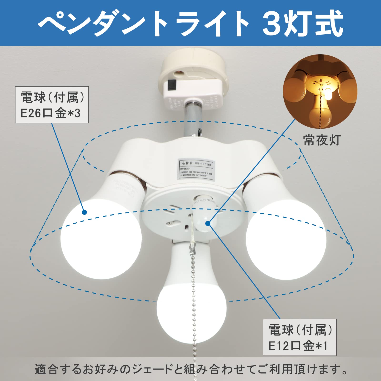 ペンダントライト 3灯 60cm超長いチェーン付き E26 LED電球付き 引掛けシーリング用 天井照明 ソケット 【E26 LED電球 60W形 昼光色*3+E12 常夜灯 電球色*1】