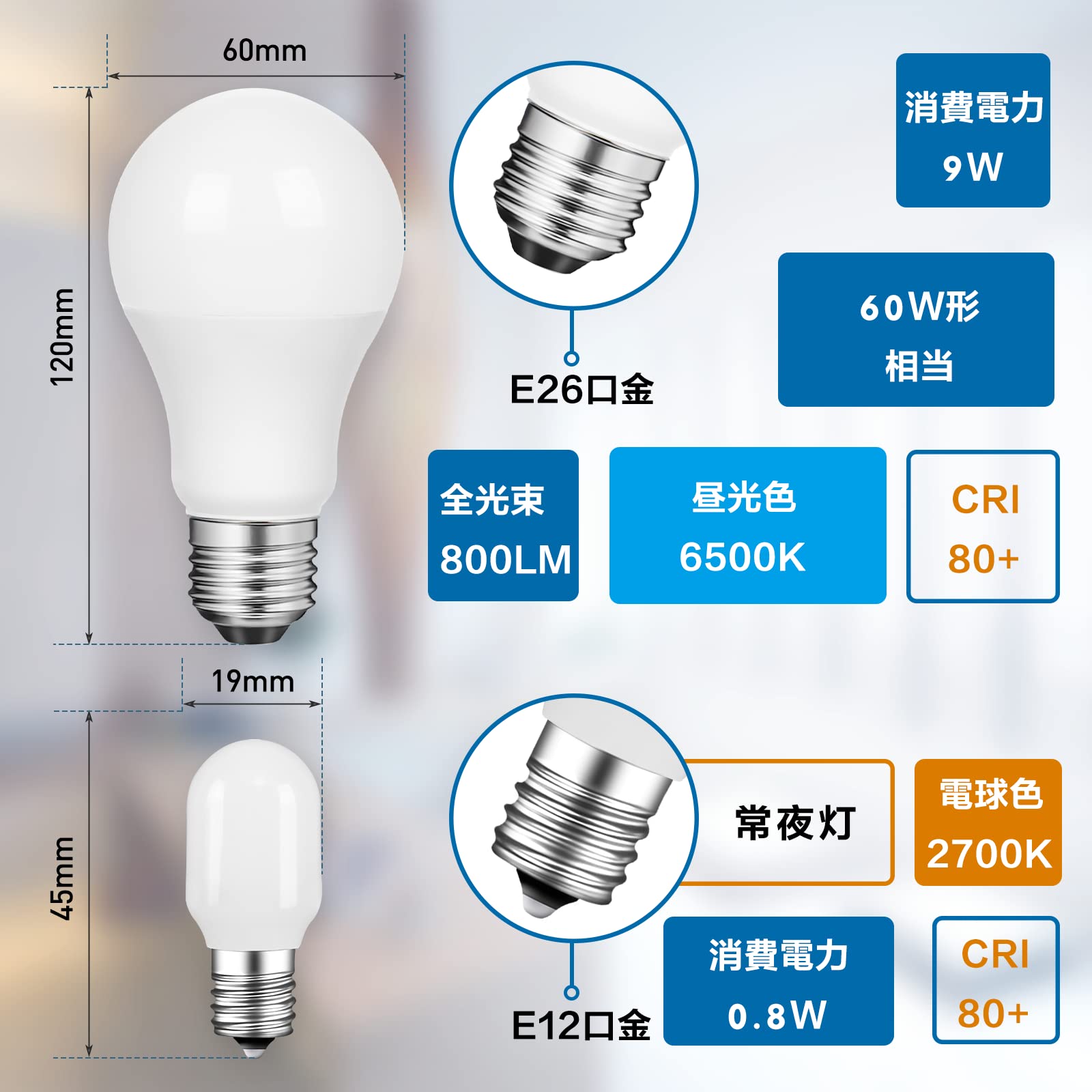 【LED電球付き】一般電球60W形相当のE26 9W LED電球(昼光色*3個)と消費電力0.8WのLEDナツメ球(電球色*1個)を付属しております。従来の白熱電球と比べ、消費電力は約85%を削減できます。常夜灯は暗い場所でも足下の視界を確保できます。RA80以上の演色性を持って、物の色を自然に再現可能です。