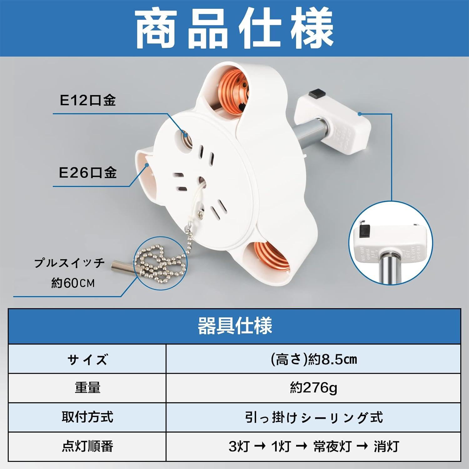 【簡単な操作】プルスイッチで3灯→1灯→常夜灯→消灯の順で繰り返し切り替わります。使用状況により、明るさを調整でき、電気代の削減にも繋げます。口金サイズに合わせて、従来の白熱電球もLED電球も取付可能です。