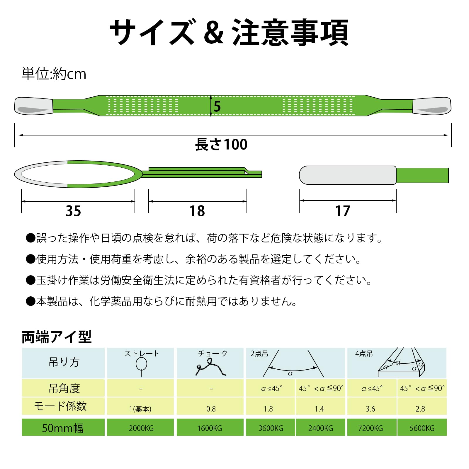 【商品仕様】■全長:1M ■ベルト幅:50mm ■緑 最大使用荷重:2000kg (ストレート吊の場合) ■安全係数:6