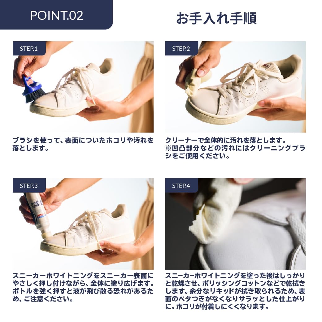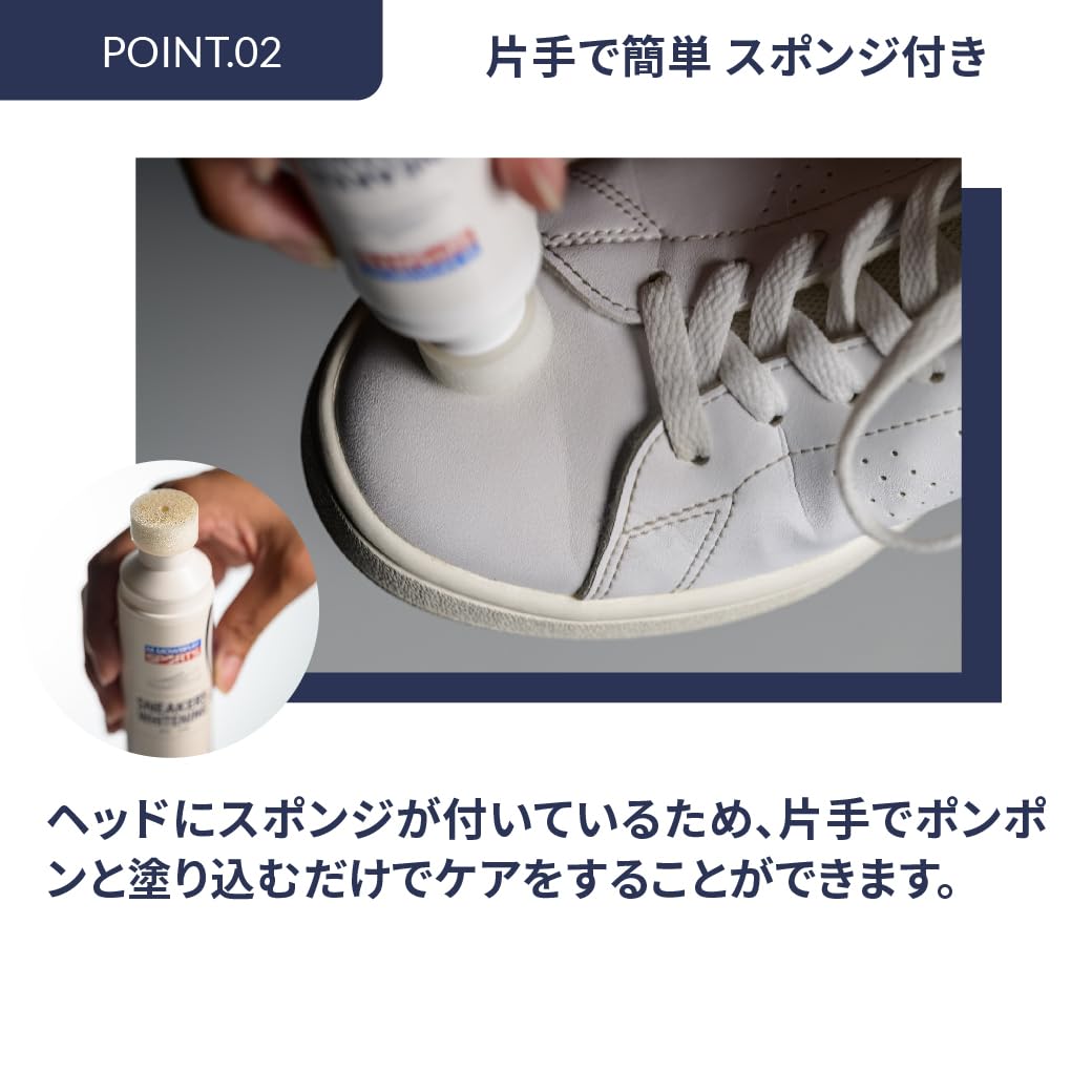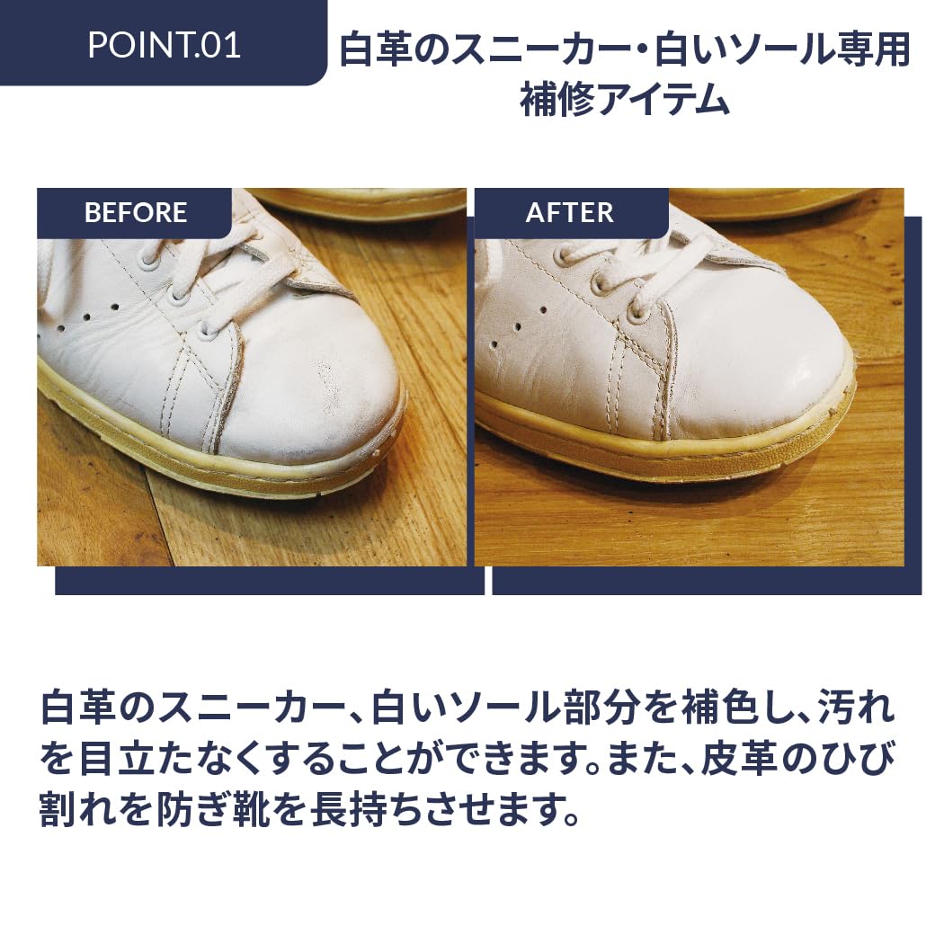 ホワイトレザースニーカーの色を補色し、汚れを目立たなくすることができる補色リキッドです。 真っ白の場合に限り、ソール部分の補色にも使用できます。 また、皮革に栄養を与えられるため、ヒビ割れを防ぎ靴を長持ちさせることができます。ヘッドには手を汚さず簡単に塗ることができるスポンジが付いています。