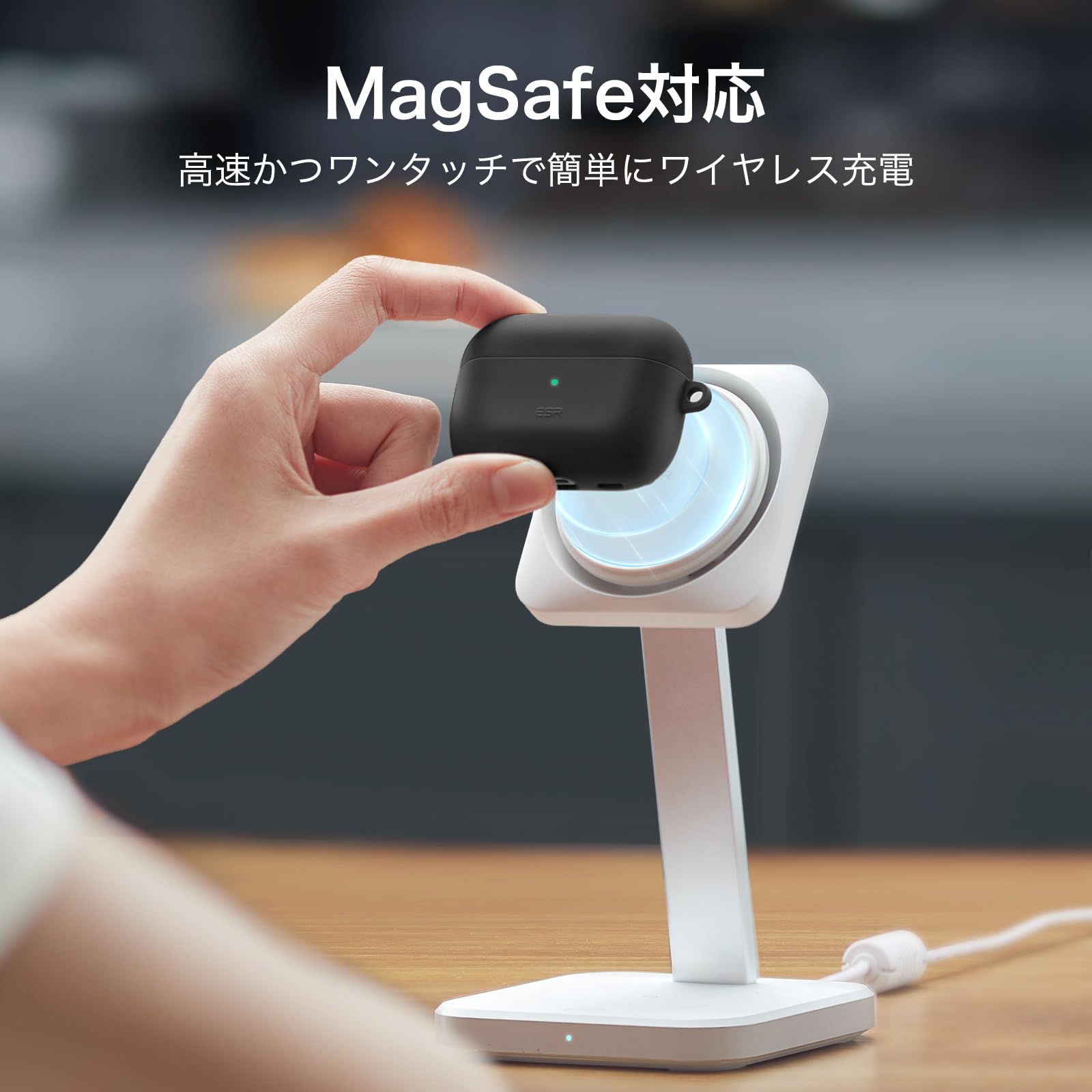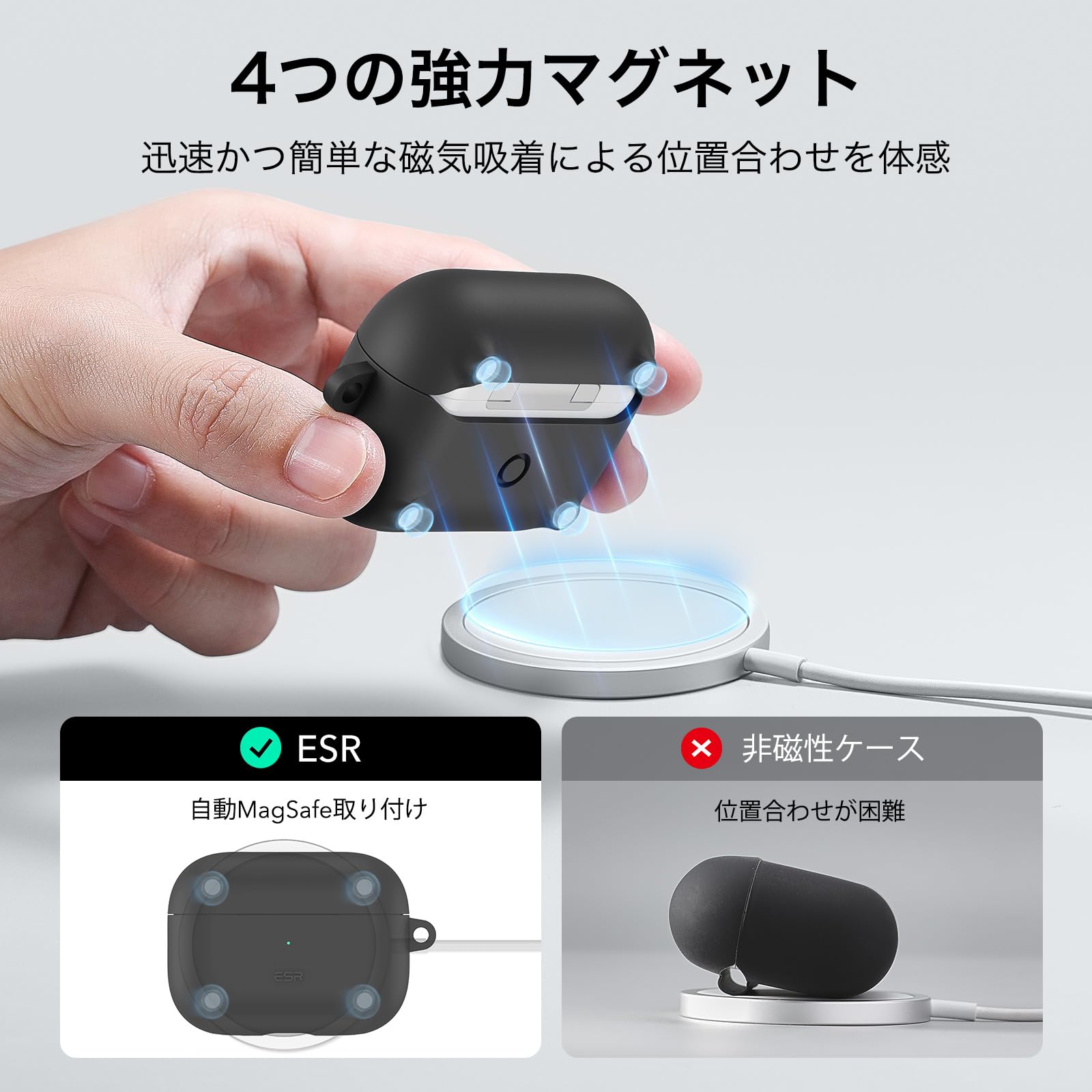 【MagSafe対応】ケース背面に内蔵された強力な磁石が、全てのMagSafeおよびHaloLock充電器を確実に吸着し、AirPodsをワンタッチでワイヤレス充電できます。