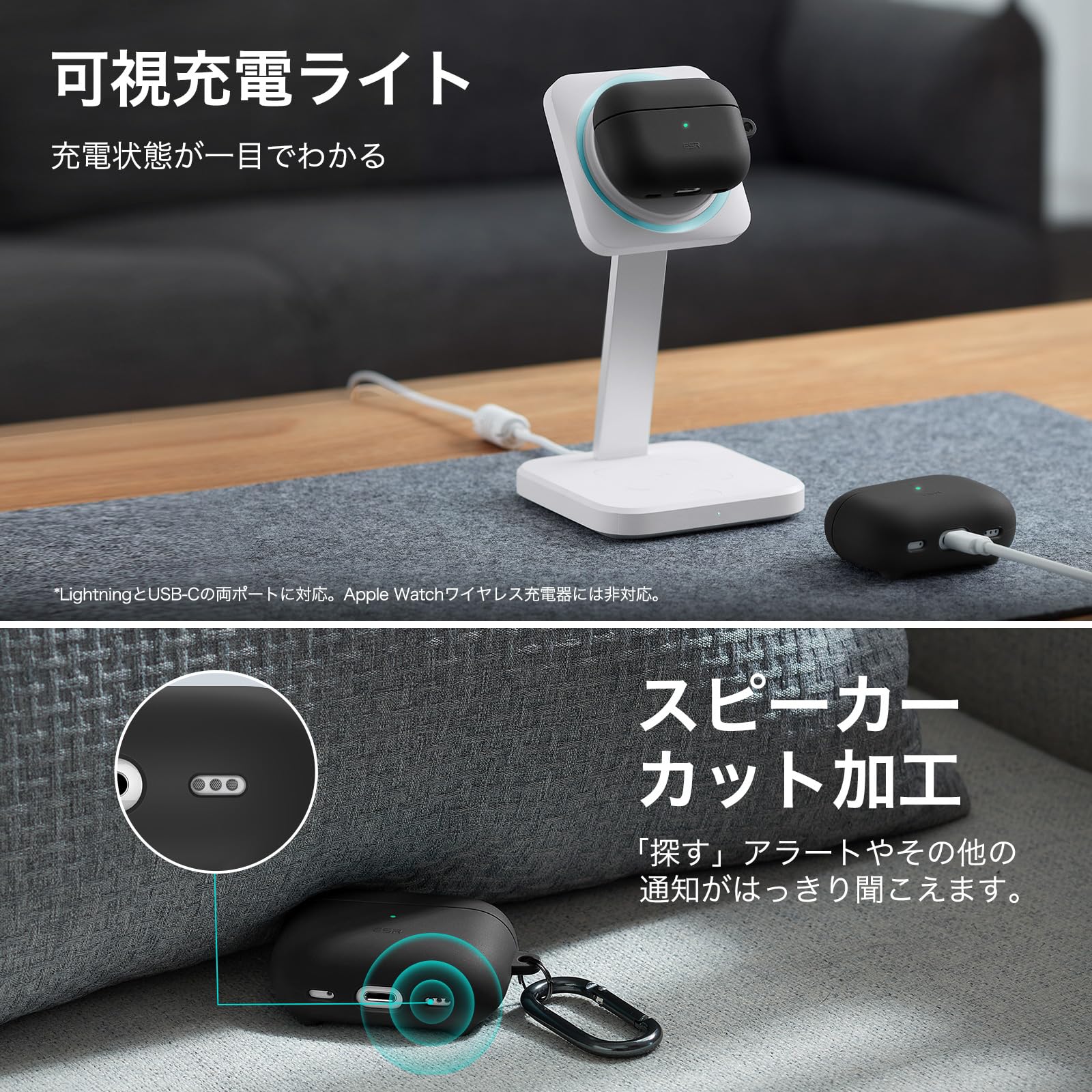 【スピーカー対応のカット加工】底面に特別に配置された開口部により、「探す」、バッテリー残量低下、ペアリングの声がしっかりクリアに聞こえます。
