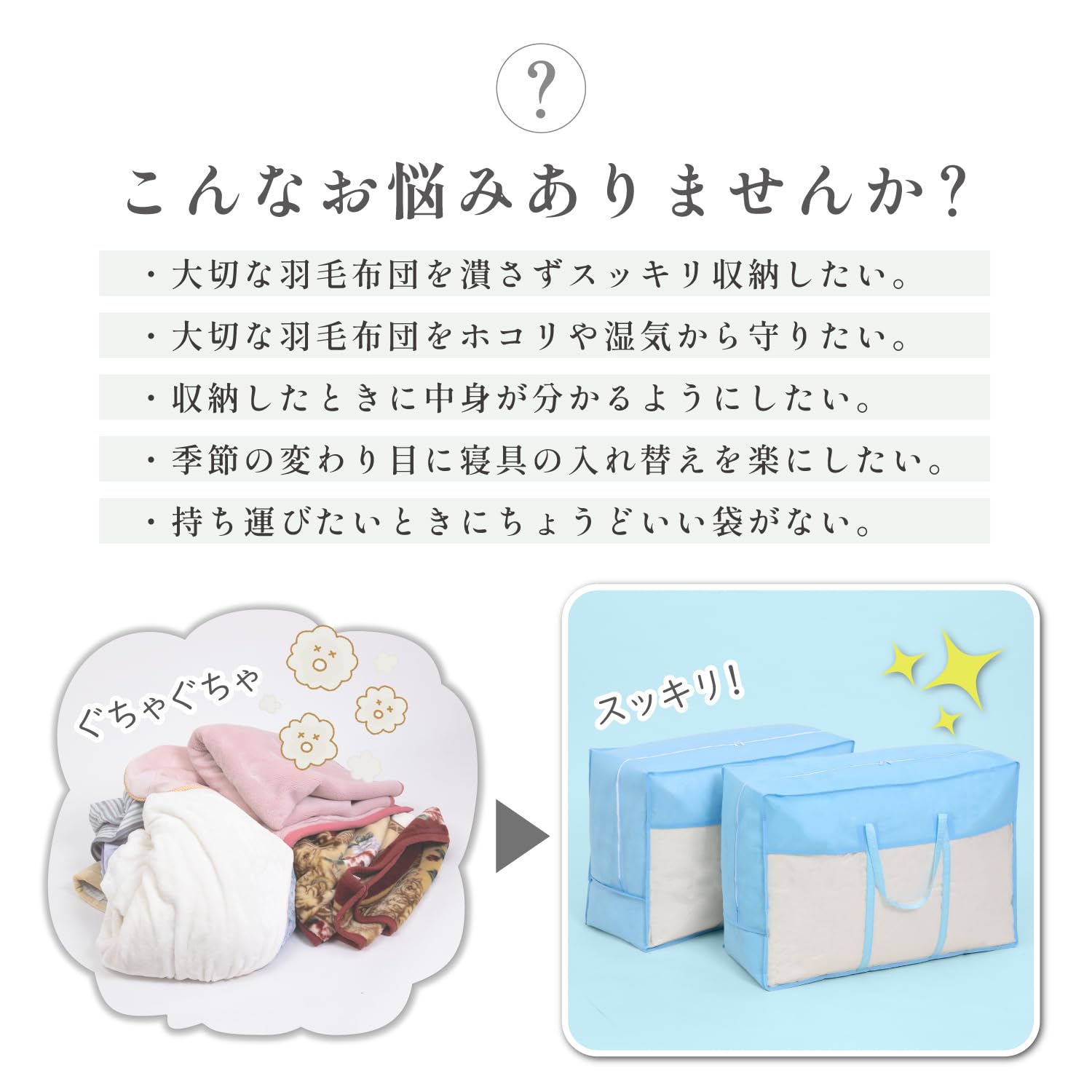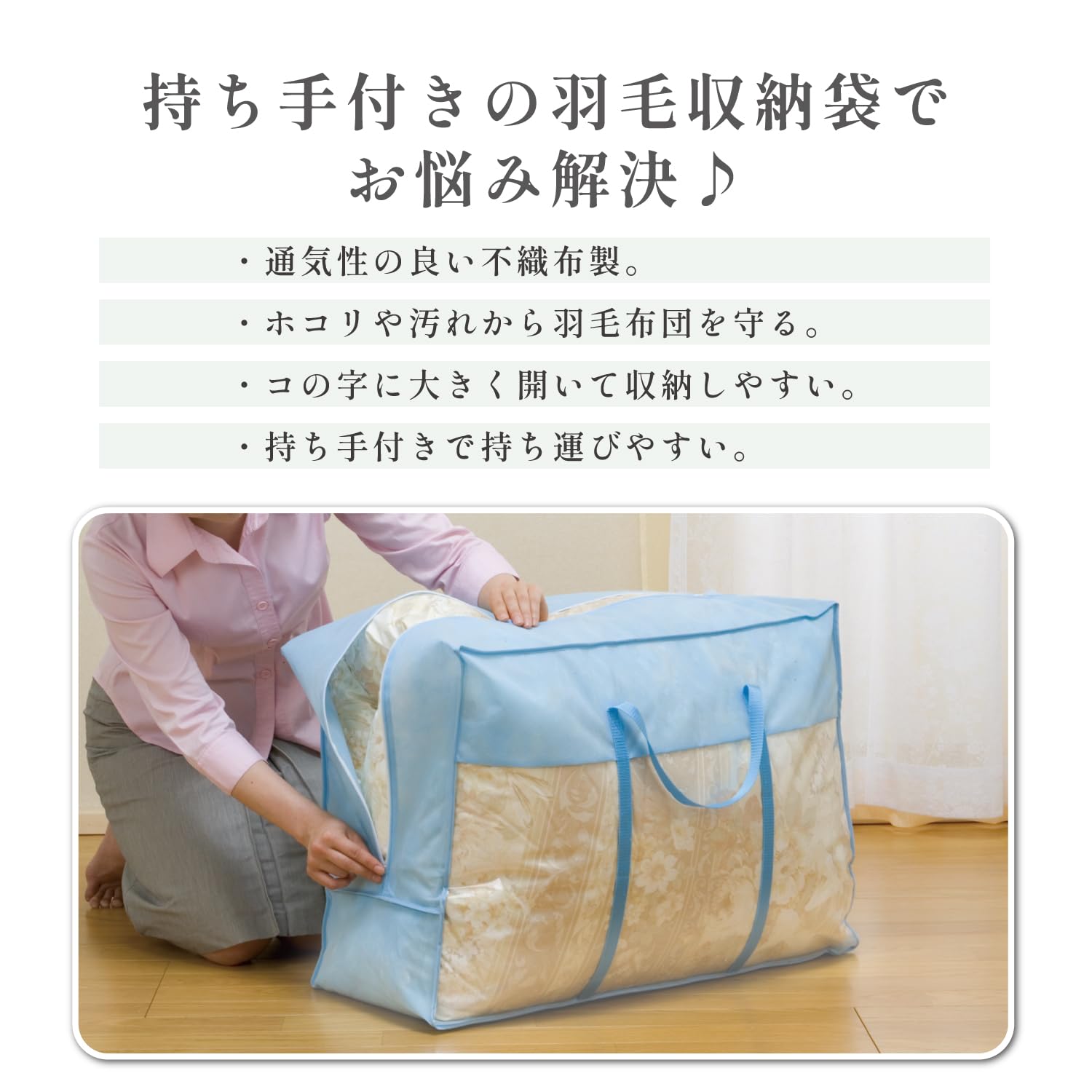 ●通気性の良い不織布製。オフシーズンや来客用の羽毛布団を湿気やホコリなどから大切に守る。