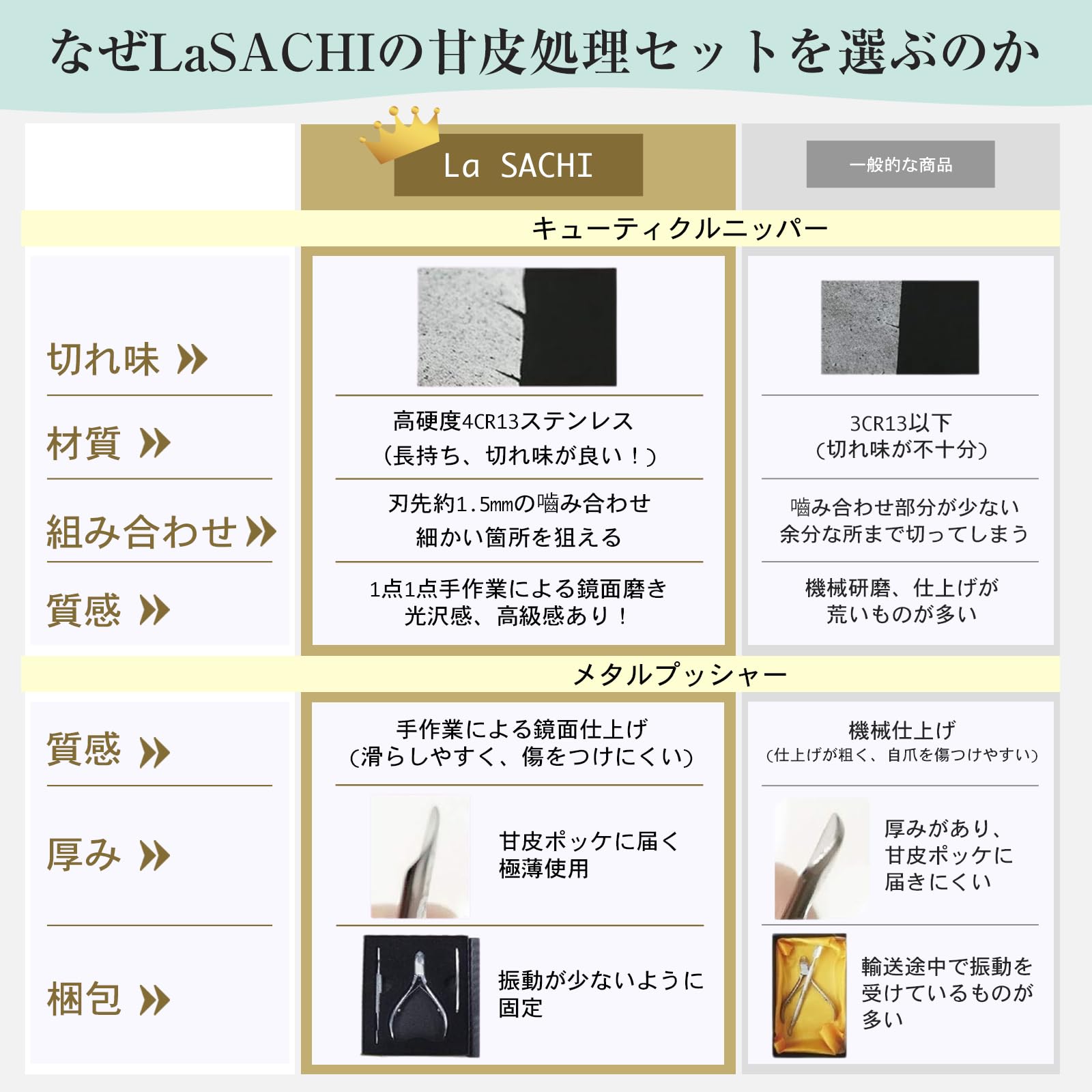 【甘皮ニッパー 】は理美容専門のハサミ職人に監修頂きました。見た目どれも同じように見えるニッパーですが、使ってみればその差は一目瞭然。本当に良いものはストレスフリーな使い心地です。La SACHIの 甘皮ニッパー は滑らかなダブルスプリングのハンドル、左右の手ともに持ち易いよう長めの設計、厳しいテストにパスした切れ味、更に刃先を1.5mmの噛み合わせにすることで、余計な皮膚をひっぱったり、切り落とすことなく、細い甘皮やささくれを狙った箇所だけスパッと切り落とせます。