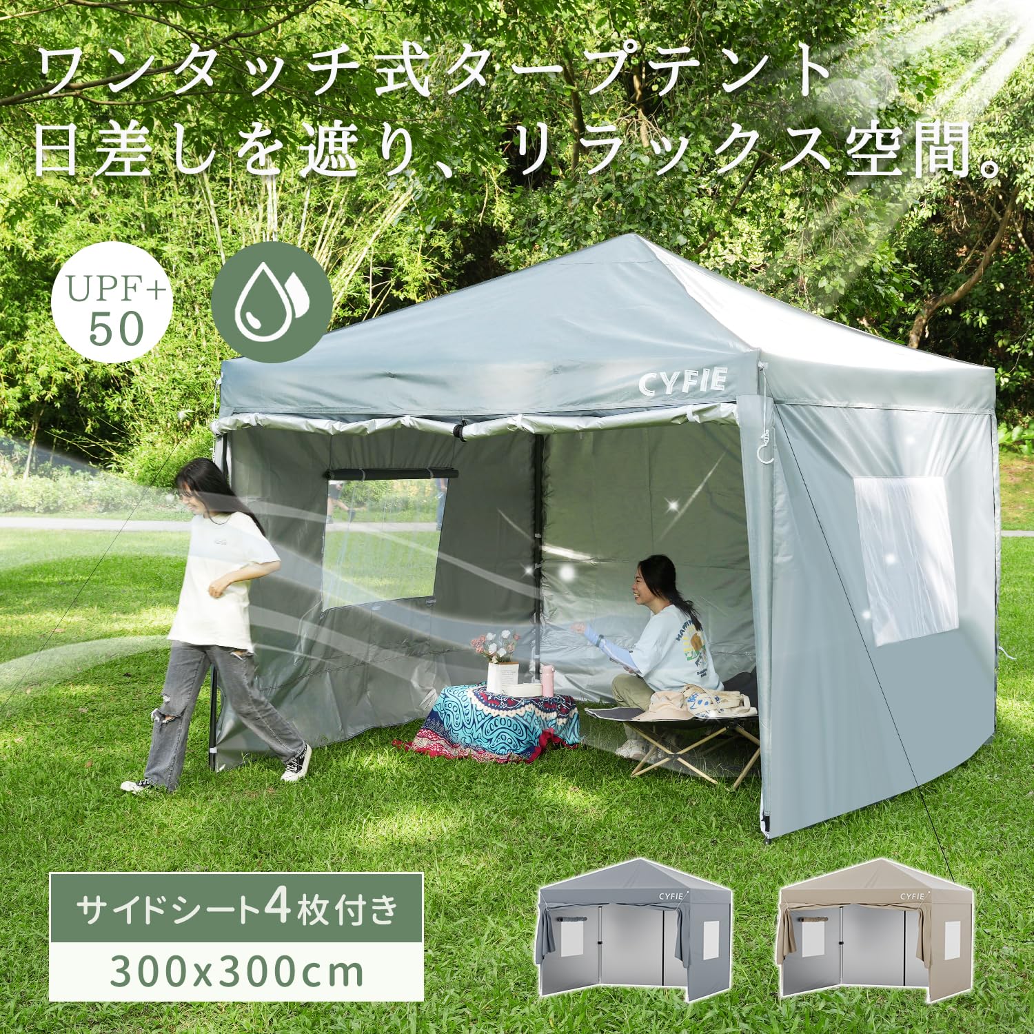 【在庫のみ】CYFIE タープテント 3mx3m 横幕/サイドシート4枚付 ワンタッチタープ 網戸付き 3段階調節 UVカット 高耐水 遮光遮熱 収納袋付 アウトド/イベント/運動会/防災 300x300cm カーキ